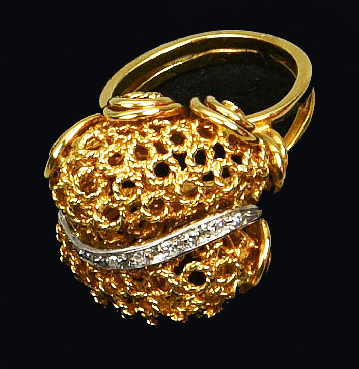 in oro giallo 18 kt, modellato con motivo a reticolo intrecciato e fila di diamanti montati su oro bianco 18 kt.