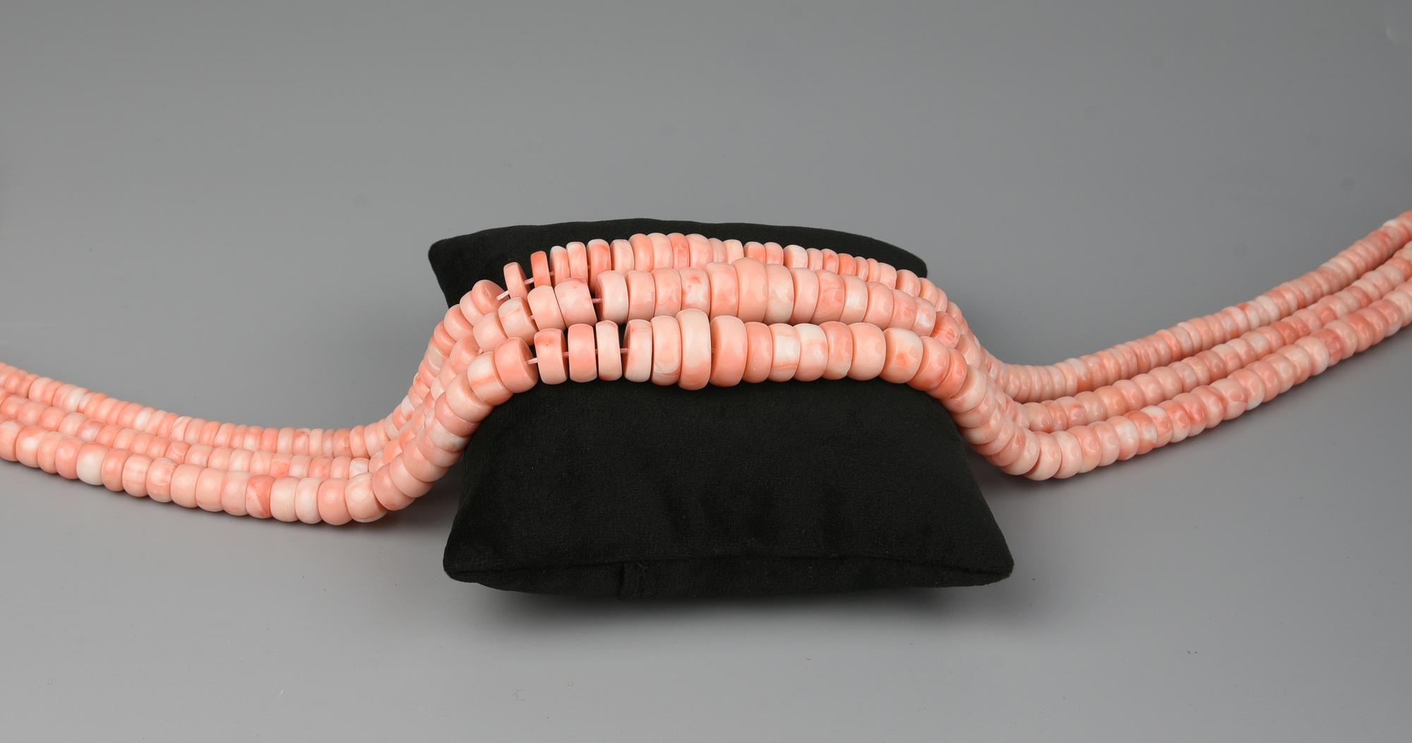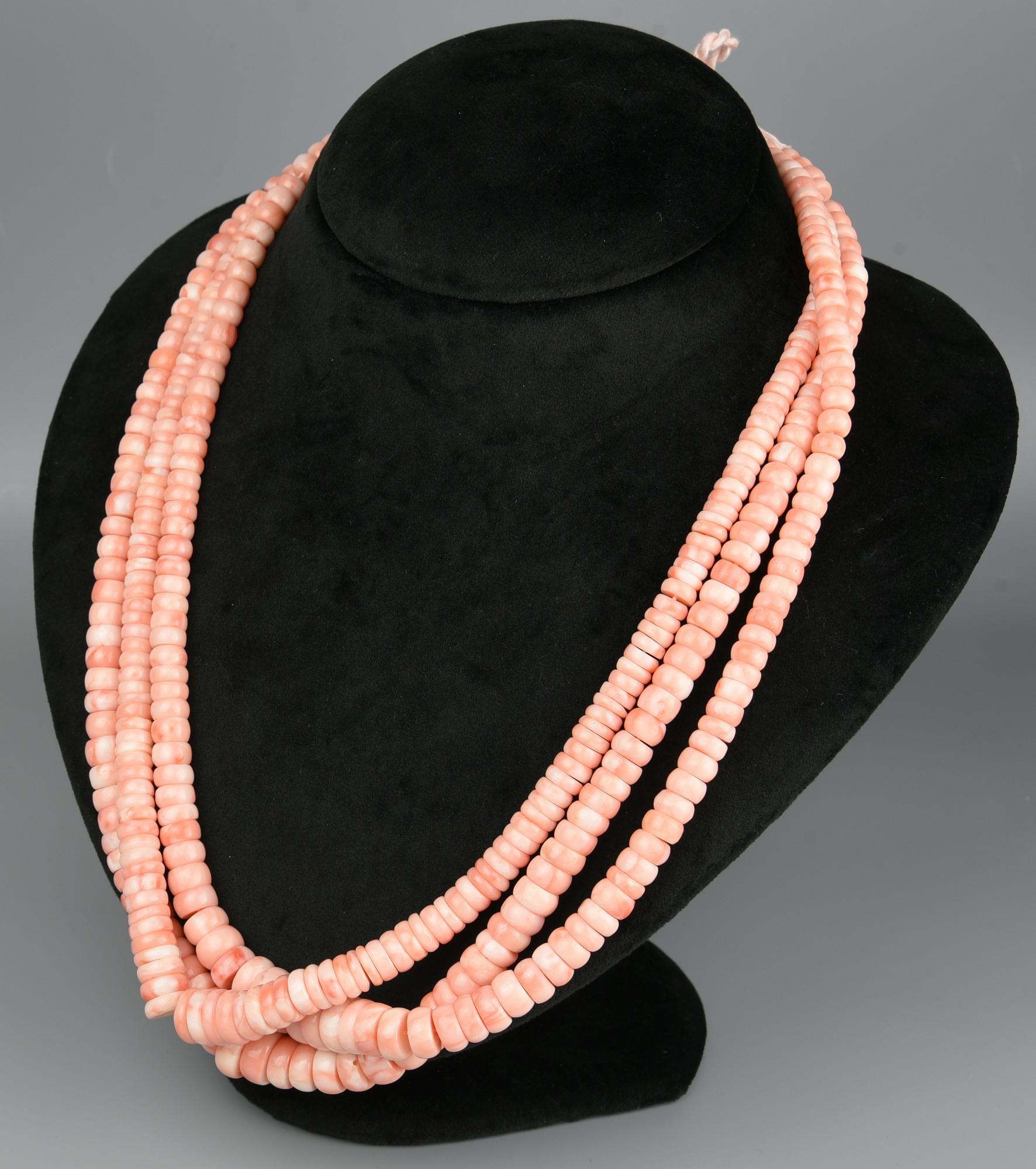 a tre fili di rondelle di corallo rosa.