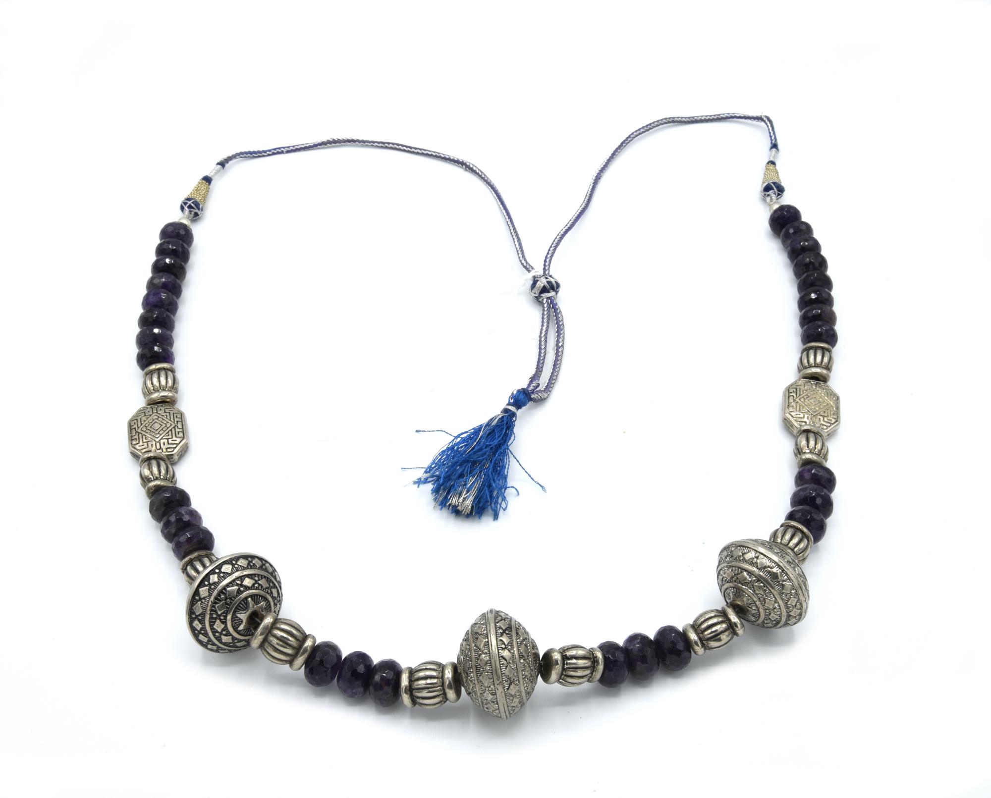 LUNGA COLLANA CON SFERE DI AMETISTA ED ELEMENTI IN METALLO ARGENTATO