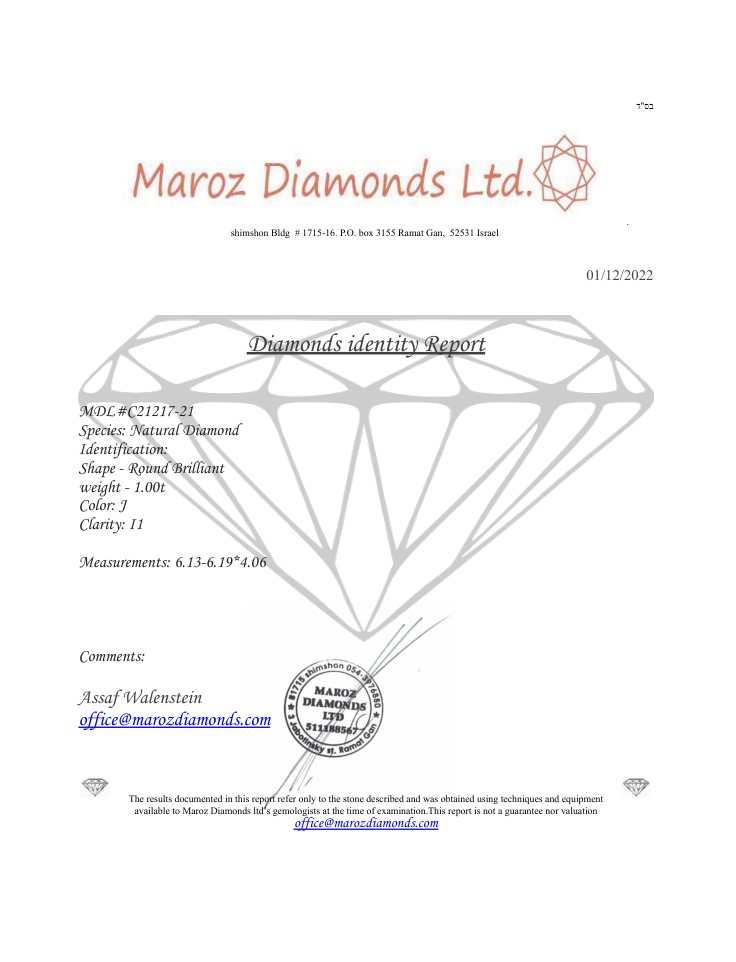 1 DIAMANTE 1 CT J - I1 - FORMA BRILLANTE - CERTIFICAZIONE Incisione Laser+ID - C21217-21
