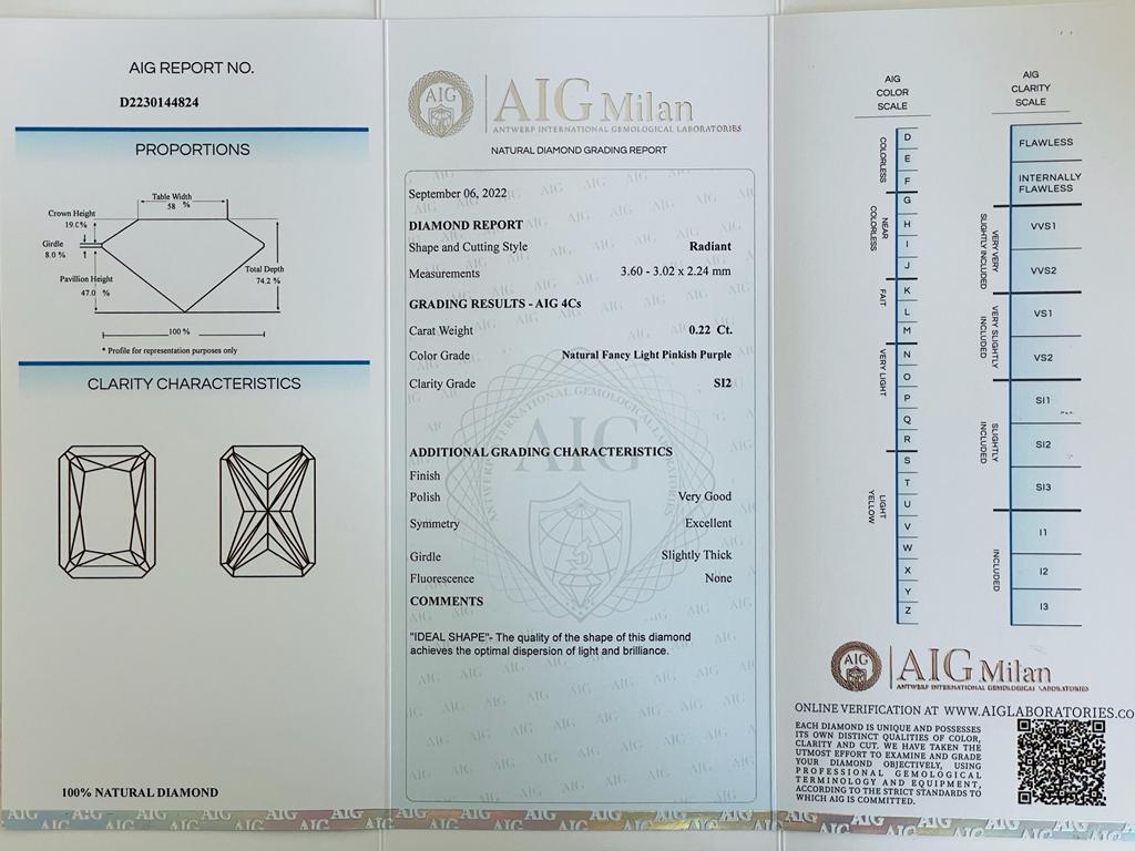 DIAMANTE 0,22 CT FANCY ROSA CHIARO VIOLA - SI2 - TAGLIO RADIANTE - CERTIFICATO AIG - F20901-39