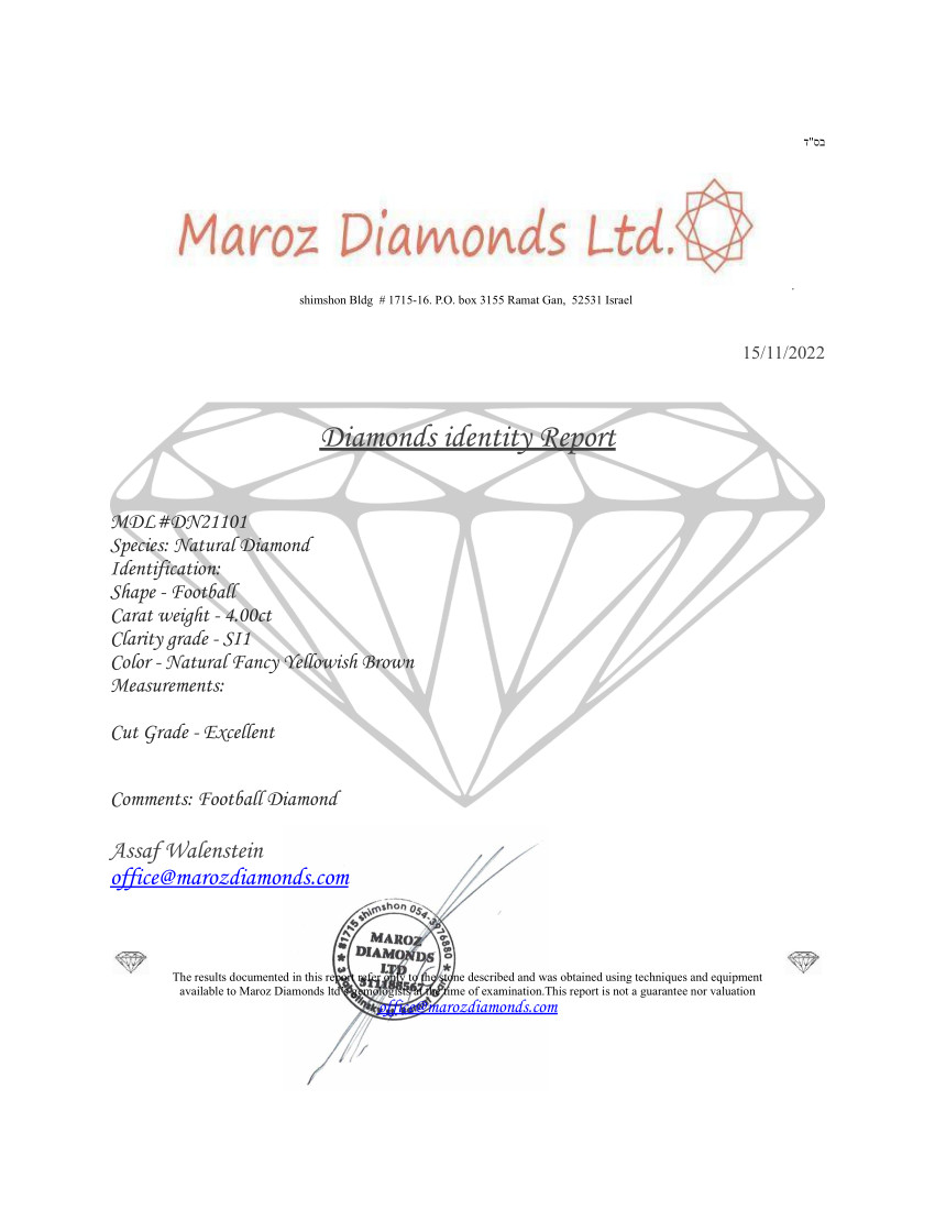DIAMANTE "FOOTBALL" 4 CT FANCY MARRONE GIALLOGNOLO - SI1 - TAGLIO FOOTBALL - CERTIFICATO ID - DN21101
