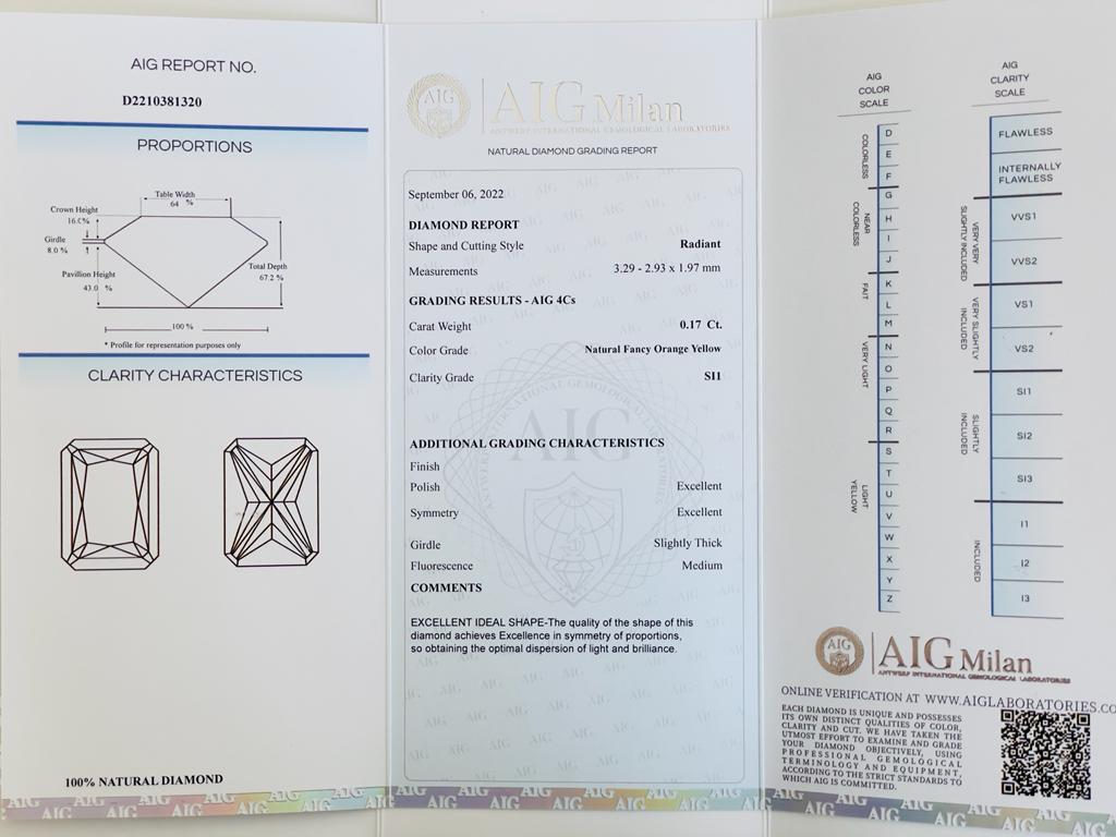 DIAMANTE 0,17 CT FANCY GIALLO ARANCIATO PUREZZA SI1 - TAGLIO RADIANTE - CERTIFICATO AIG - F20901-18