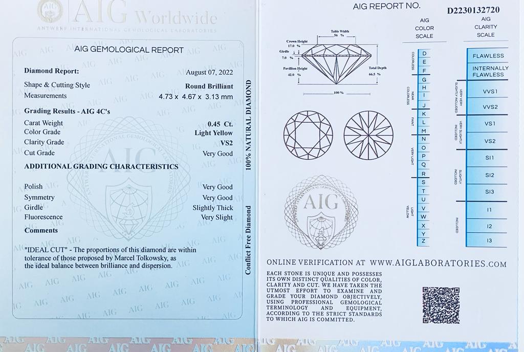 DIAMANTE 0,45 CT GIALLO CHIARO PUREZZA VS2 - TAGLIO BRILLANTE - CERTIFICATO AIG - C20807-22