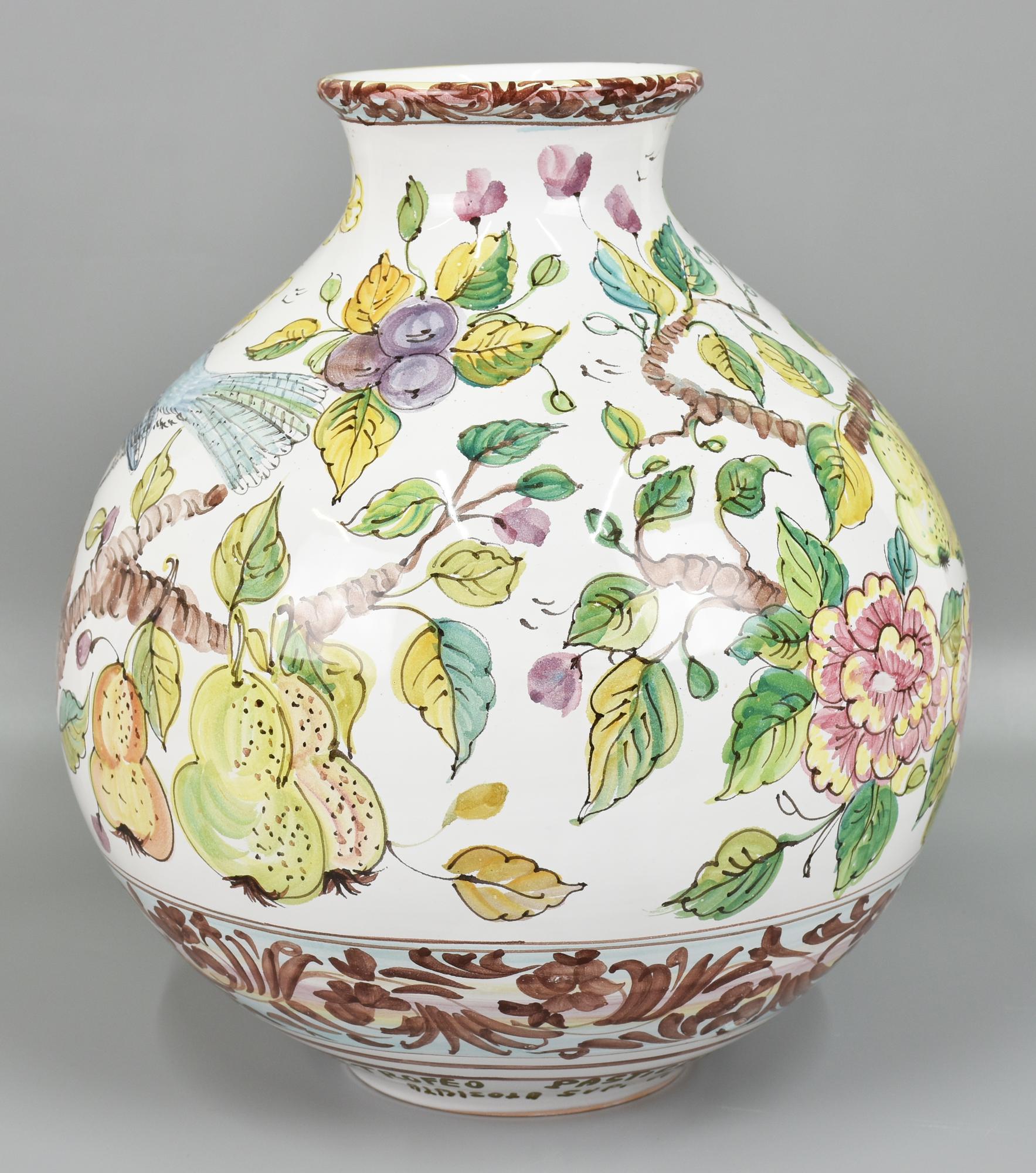 grande vaso in ceramica di Albissola decorato con volatili, frutta e fogliame, firmato Musumeci Albissola sotto la base