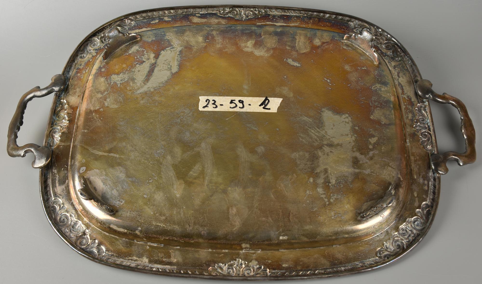 VASSOIO METALLO ARGENTATO decorato con motivi floreali cm 36,5x56 Lievi...