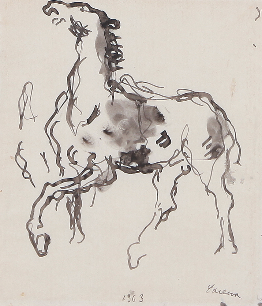 FELICE CARENA Cumiana (To) 13/08/1879 - Venezia 10/06/1966 Cavallo, 1963 inchiostro acquerellato su carta cm. 24x21, firma in basso a destra, anno in basso al centro, verbale di perizia a cura della Finarte (MI) su foto.