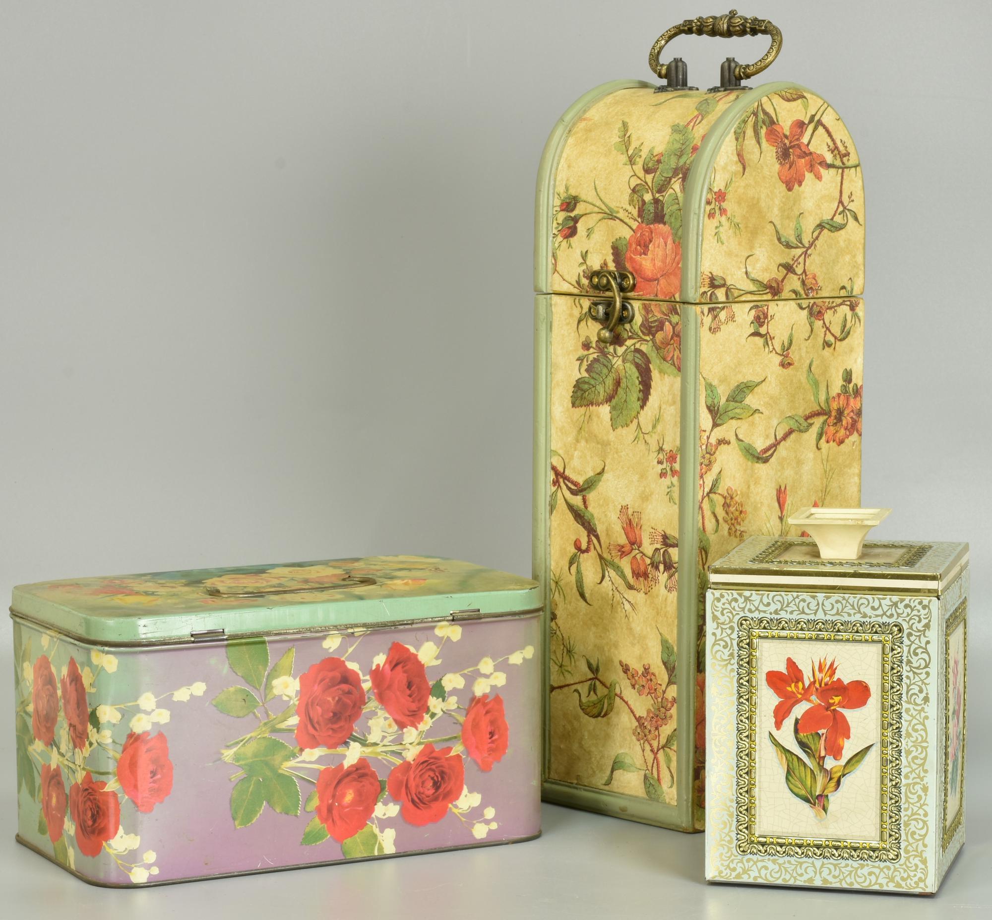 due in latta e una in legno decorate con motivi floreali
