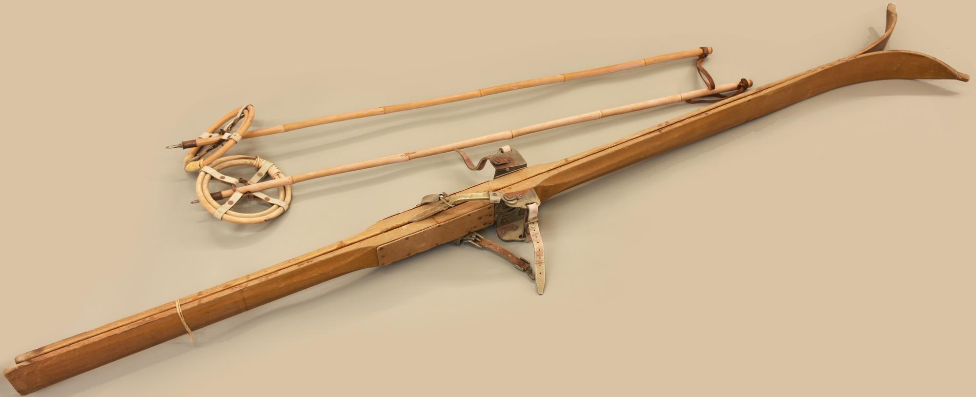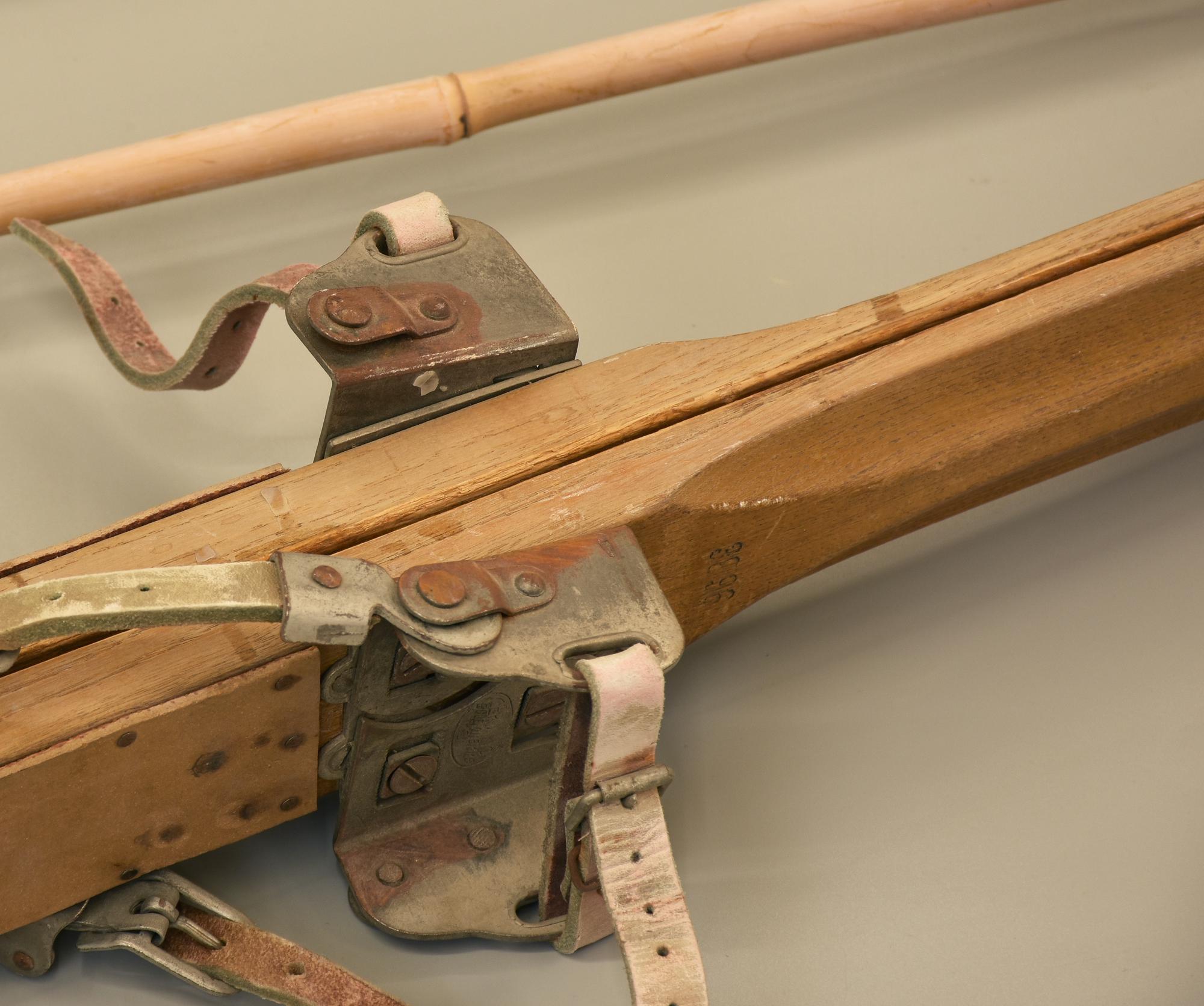 Lotto 268 | SCI D'EPOCA in legno con allacci in metallo e tessuto, completi di bastoni....