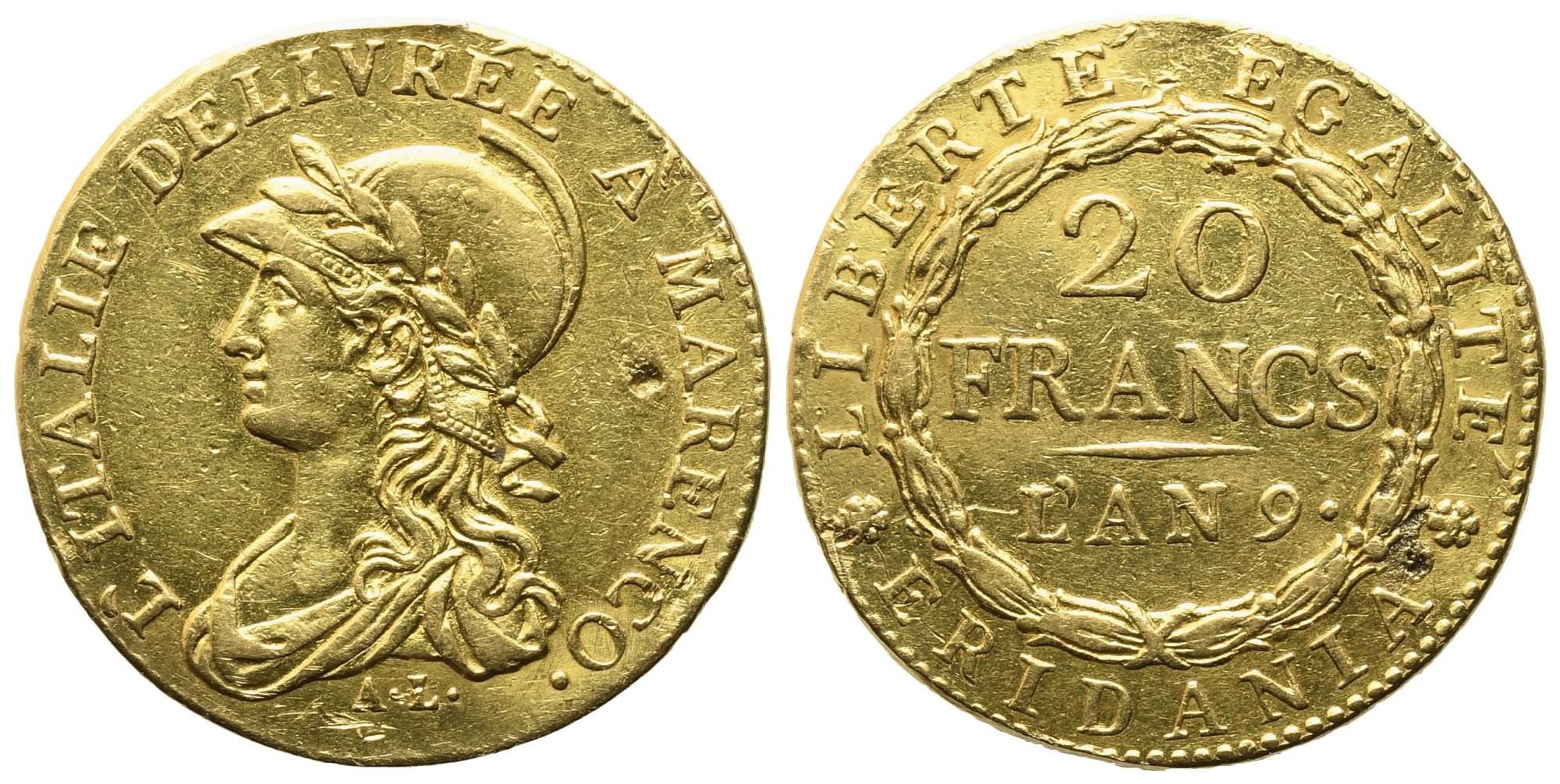 Torino. Repubblica Subalpina (1800-1802). 20 franchi 1801. Au (6,26 g). qSPL. Tracce di montatura non deturpante.