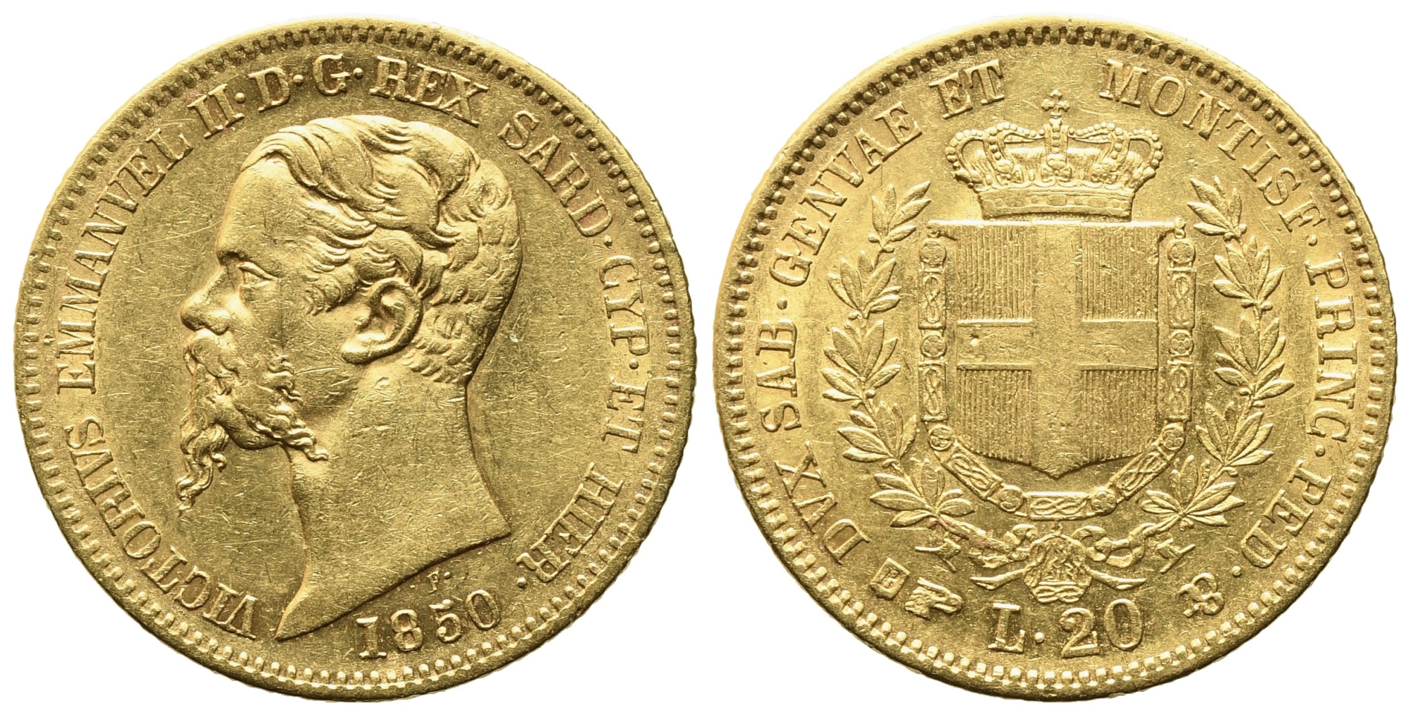 Torino. Regno di Sardegna. Vittorio Emanuele II, 20 lire 1850. Au (6,43 g). NC. Gig.2 qSPL