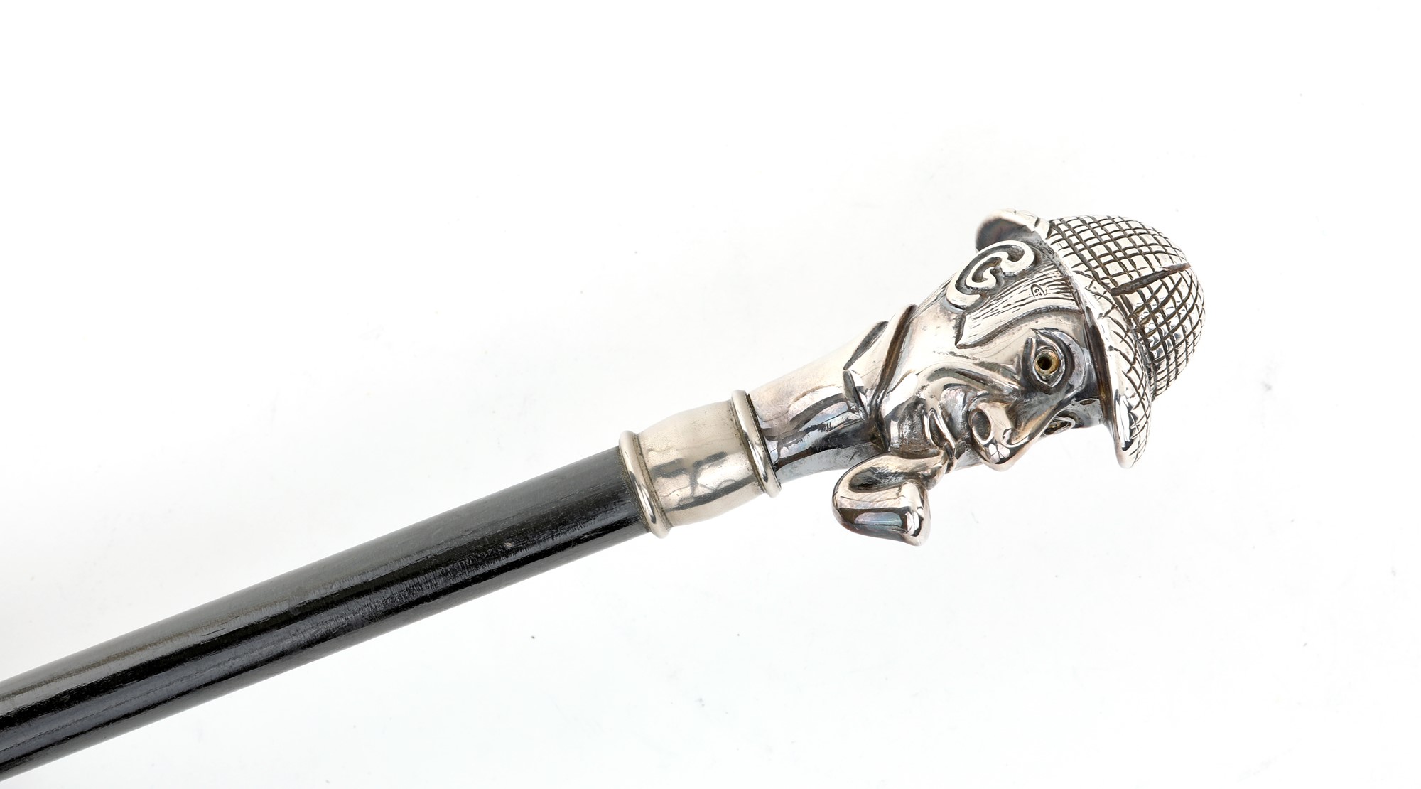Bastone da passeggio "Sherlock Holmes" con impugnatura in argento 925 a raffigurare il noto personaggio letterario, cm 100