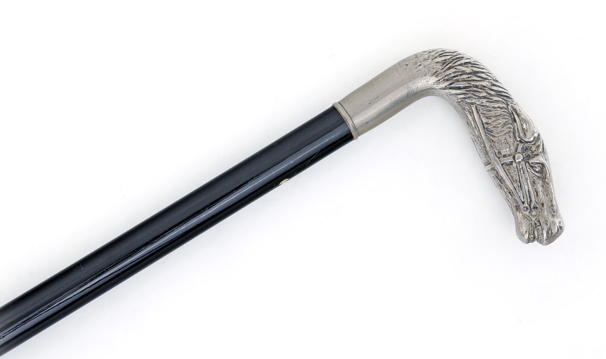 Bastone da passeggio con impugnatura in forma di testa di cavallo in argento....