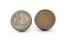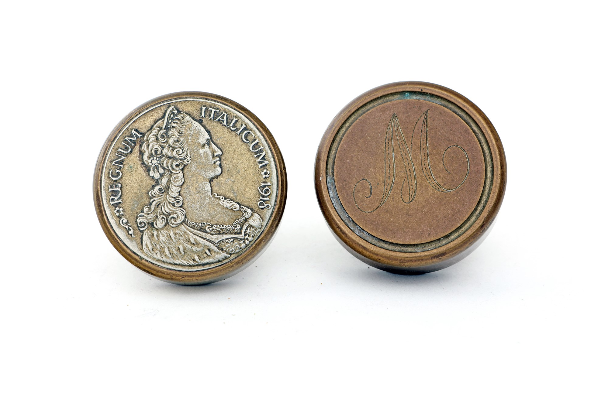 Due bastoni da passeggio con impugnatura a disco caratterizzata da una M e da moneta con profilo femminile con Regnum Italicum 1918, cm 90,5