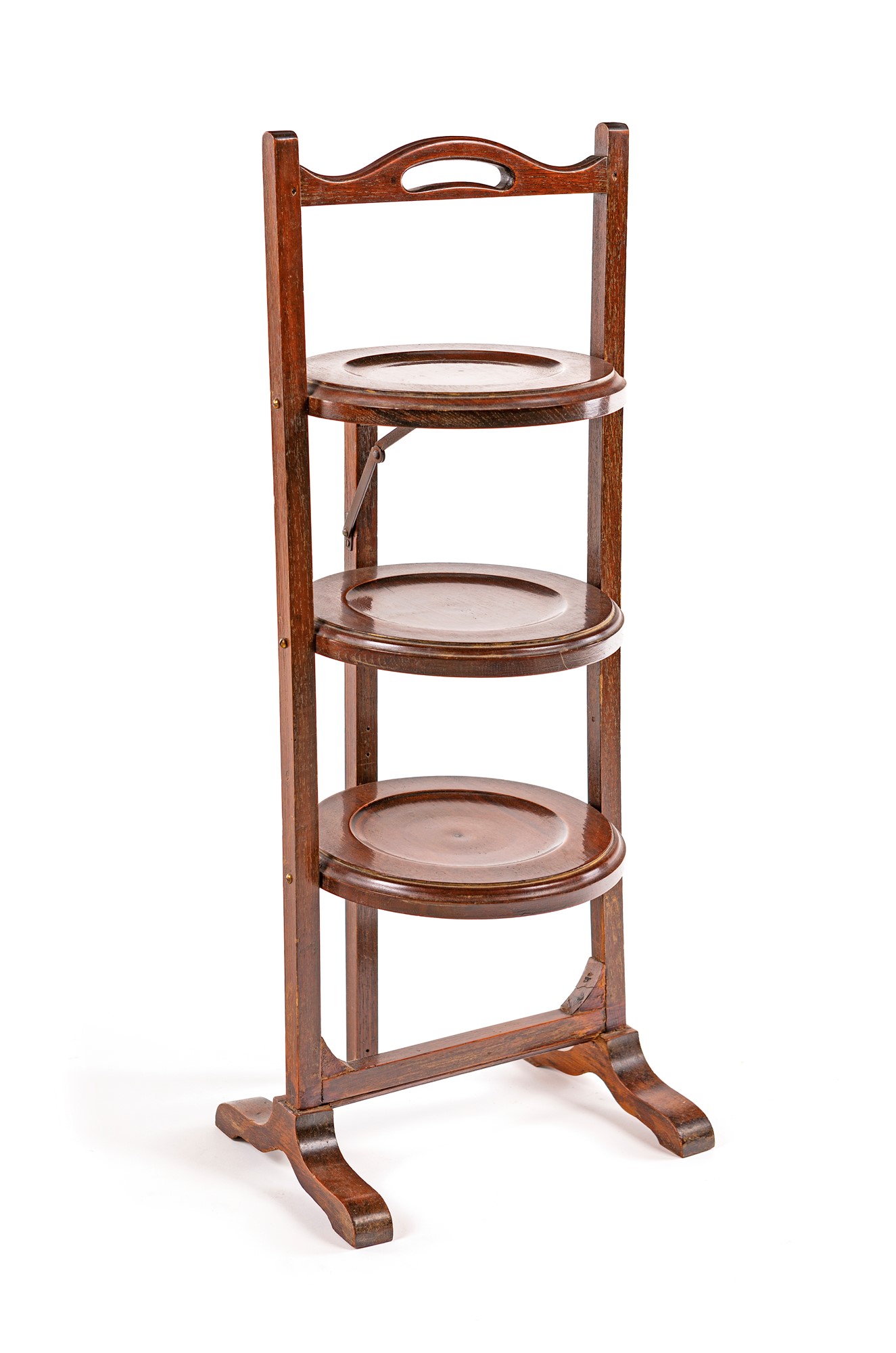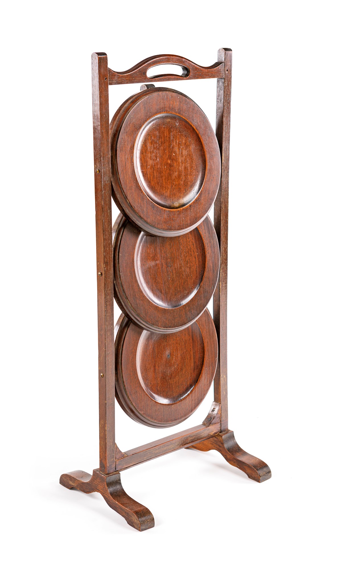 Antico tavolino servomuto in rovere, Inghilterra struttura pieghevole a tre piani circolari , cm 73x28x26