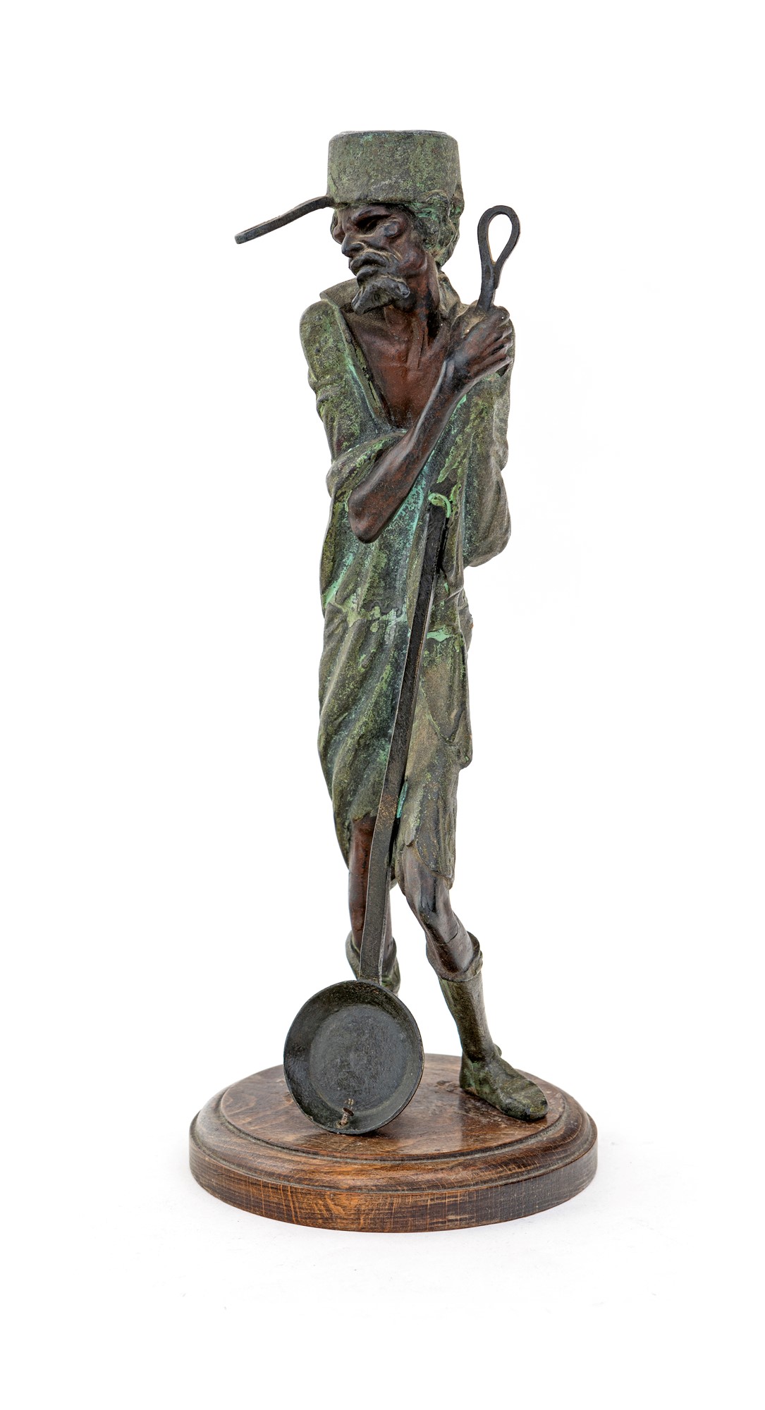 Scultura in bronzo patinato, fine del XIX secolo raffigurante un venditore moresco di pentole, ritratto appoggiato al lungo manico di una padella con una casseruola sulla testa che funge da portacandela. Difetti e restauri, altezza cm 32