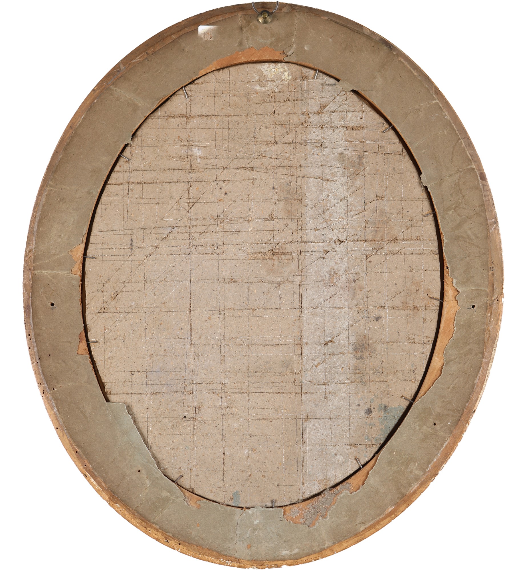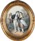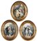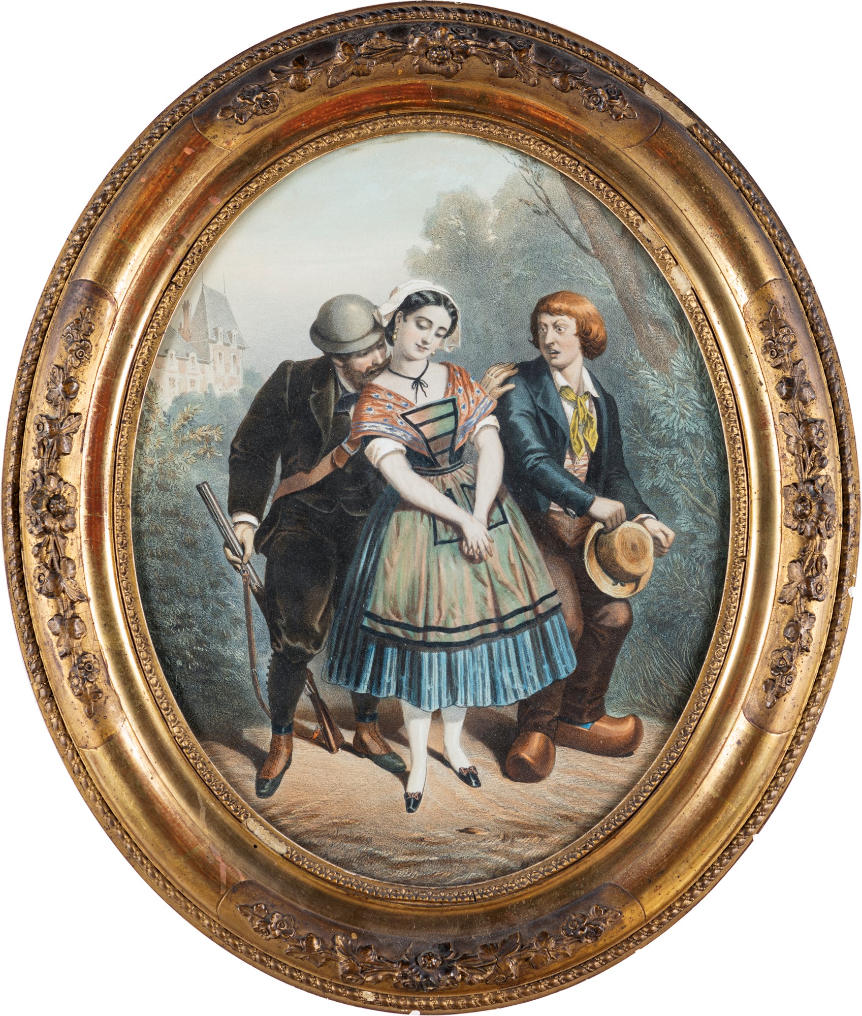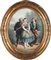 Pittore del XIX secolo, Tre allegorie di proverbi Tre allegorie di scene galanti entro cornici in legno dorato impreziosite da rilievi vegetali in pastiglia. Litografie su carta ovale colorate ad acquerelliAl verso presentano etichette d'epoca trilingue (francese, spagnolo, inglese) che illustrano i detti: a) Rira bien qui rira le derrier b) Attention dangereuse c) À tout seigneur tout honneur, cm 40x31 - in cornice: cm 55x45