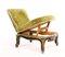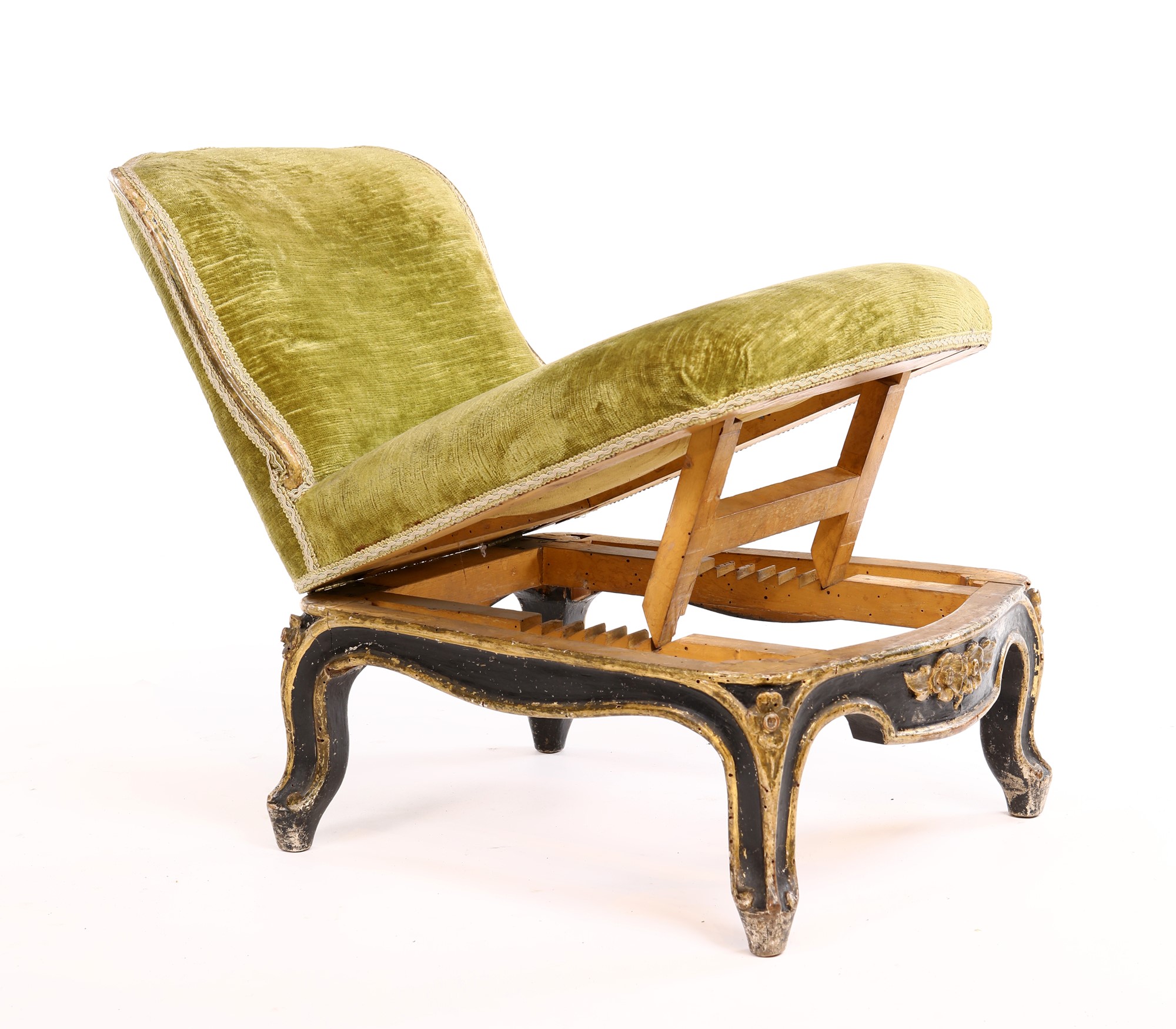 Poltroncina bassa in legno laccato nero e oro, Italia meridionale, XVIII/XIX secolo con cornici sagomate centrate da rilievi intagliati; schienale e sedile imbottito, quest'ultimo reclinabile, piedi sagomati, cm 56x45x44 - la seduta altezza cm 25