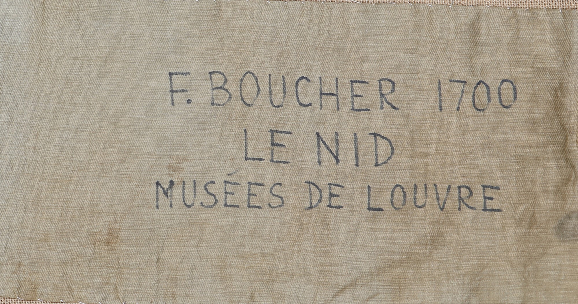 Arazzo meccanico, edizioni d'arte di Rambouillet, Francia, XX secolo raffigurante "I regali del pastore" (o "Il nido") da Francois Boucher. Iscritto al verso F. Boucher - Le Nid - Musée de Louvre, cm 181x236