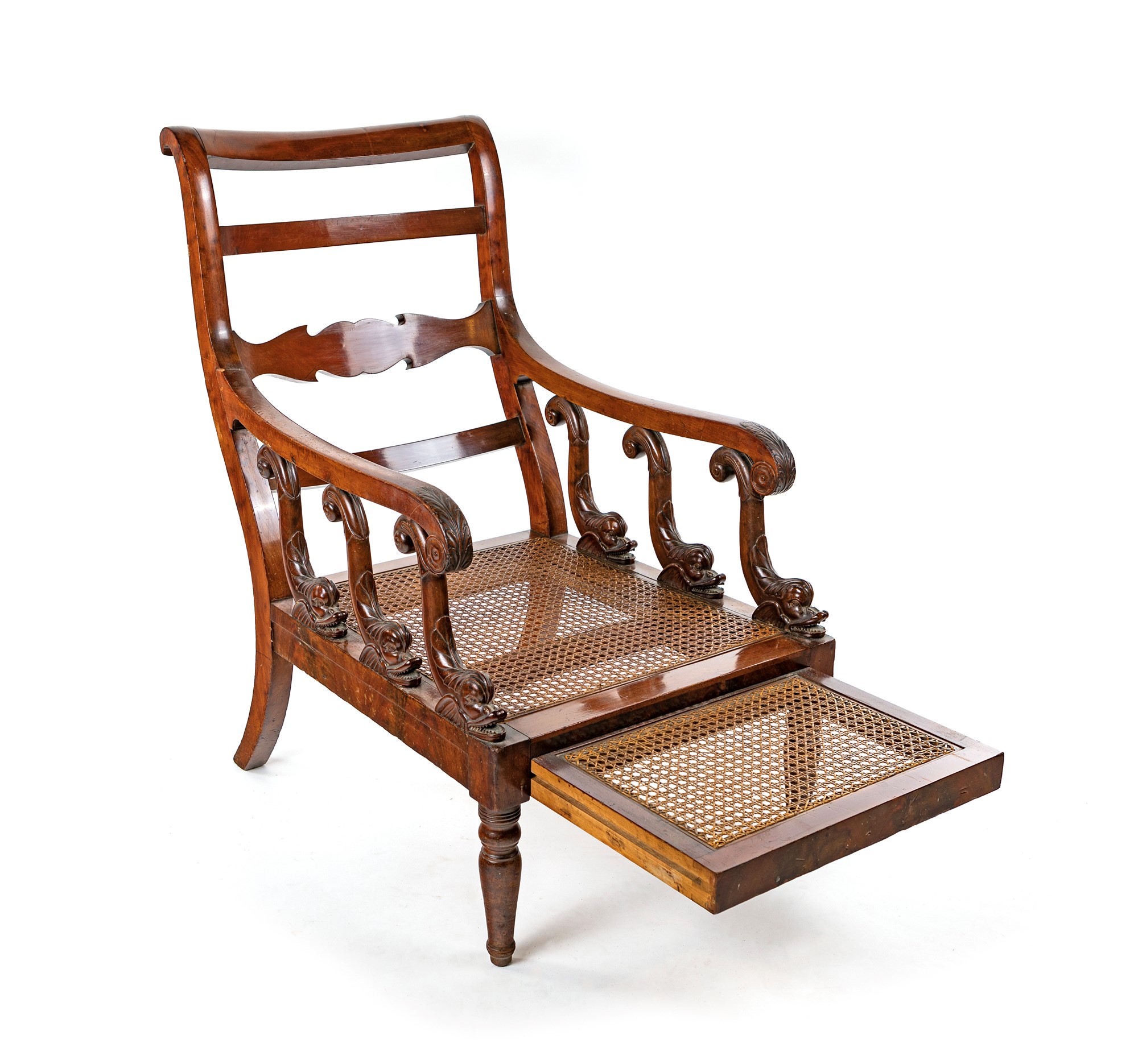 Poltrona da riposo in mogano, prima metà del XIX secolo con schienale a giorno, sedile con poggiapiedi estraibile sottostante rivestiti in paglia di Vienna, completa di cuscini in velluto a coste verde; braccioli lineari terminanti a ricciolo, sorretti da tre figure di delfino, piedi anteriori a balaustro, posteriori a sciabola, cm 96x58x75 - allungata cm 100