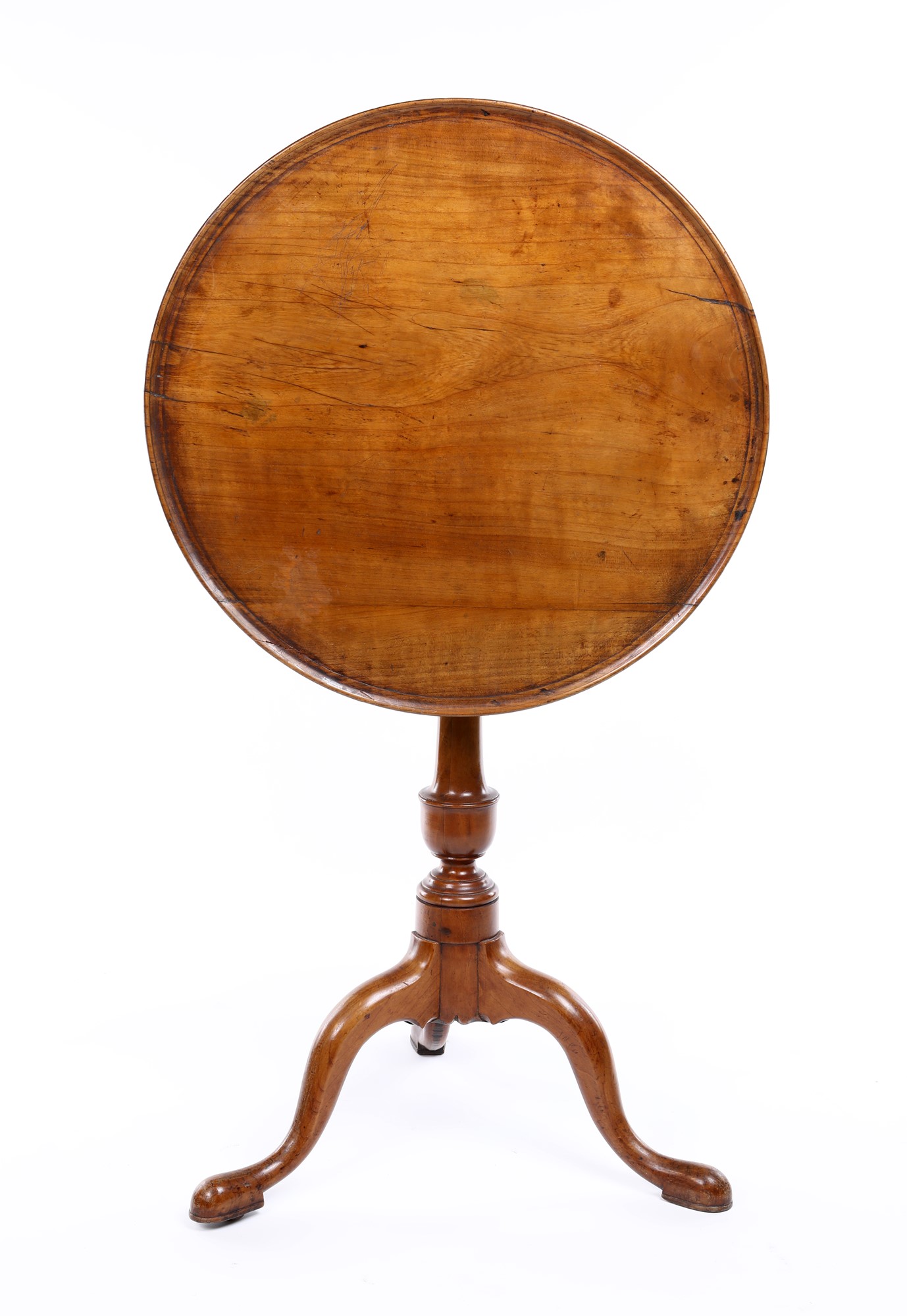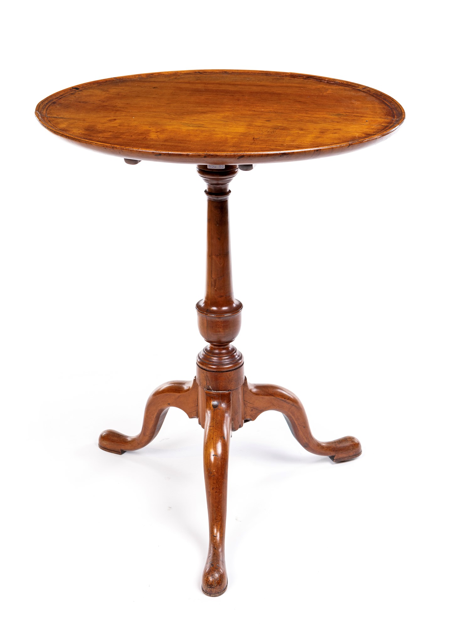 Tavolino in legno di frutto, Inghilterra, prima metà del XIX secolo con piano circolare a vela con orlo rialzato, sostegno a colonna su base tripode sagomata, cm 71x57
