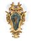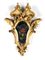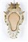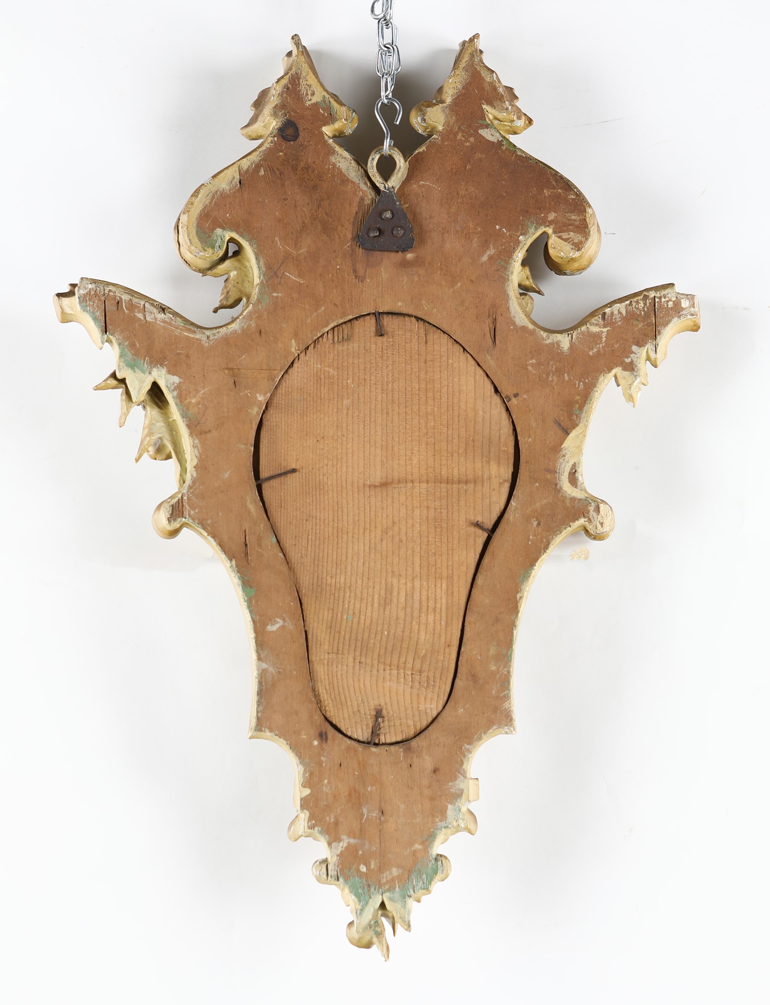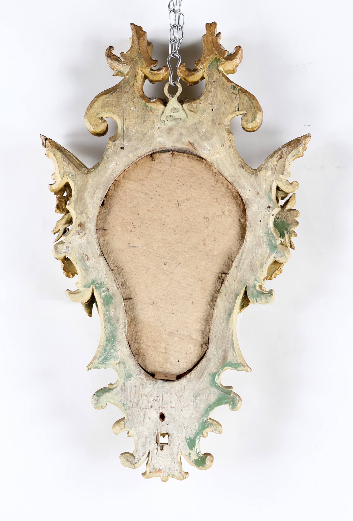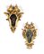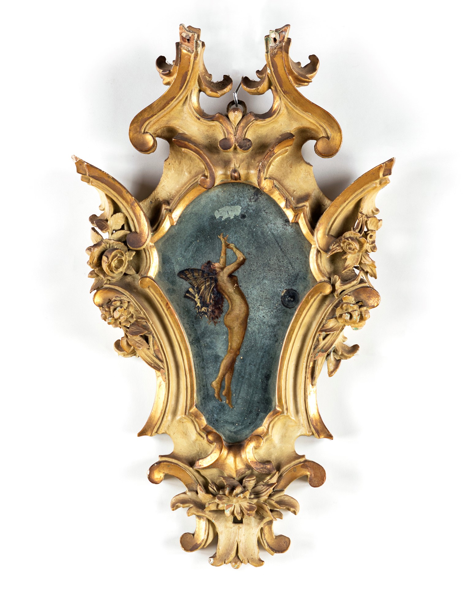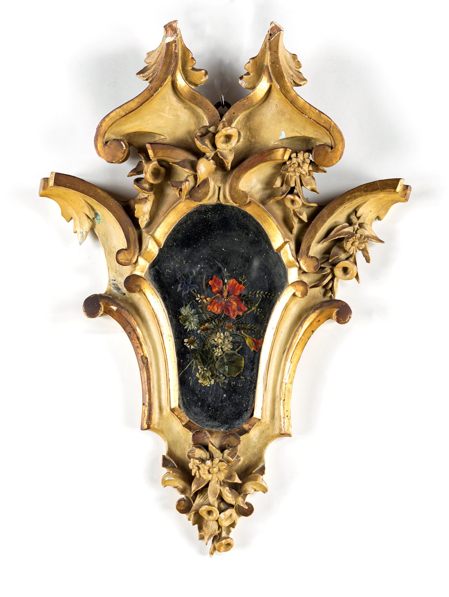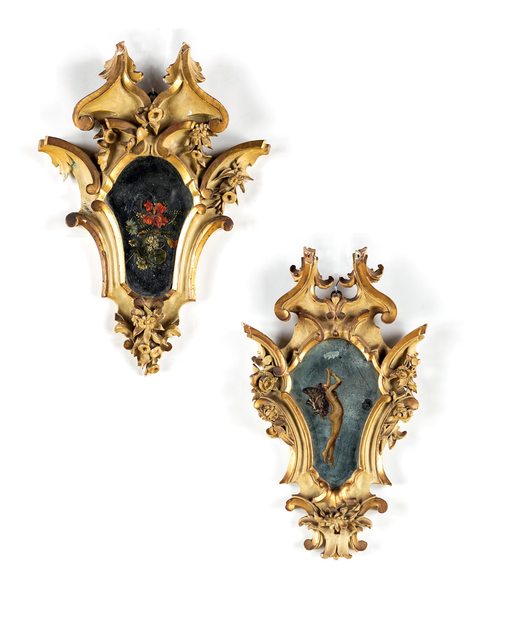 Due specchierine in legno dorato, XVIII e XIX secolo con cornici di impostazione architettonica dalle analoghe caratteristiche e specchi dipinti rispettivamente con figura femminile alata e composizione di fiori. Rotture e mancanze, cm 50x30 ca.