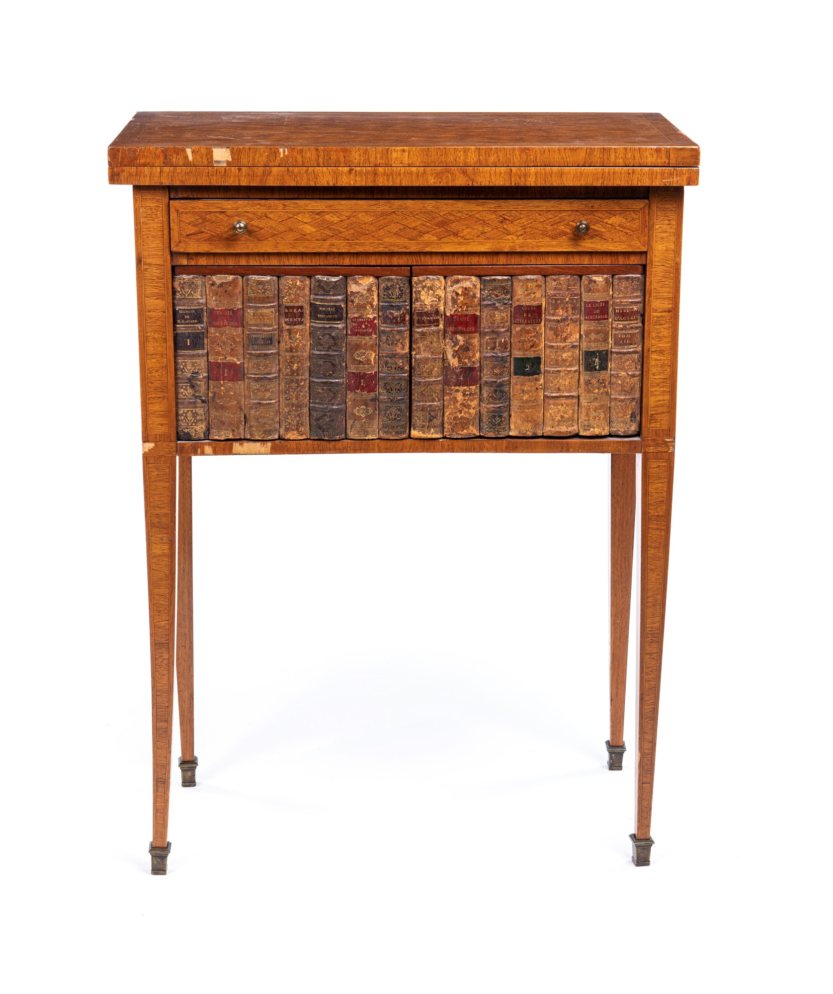 Mobiletto da centro intarsiato a marqueterie geometrica, XIX secolo con piano a libretto rivestito in pelle, facciata scandita da un tiretto e due ante caratterizzate da dorsi di libro in cuoio con titoli impressi; gambe rastremate calzate di puntali in ottone, cm 77x56x28 - aperto cm 75x56x56
