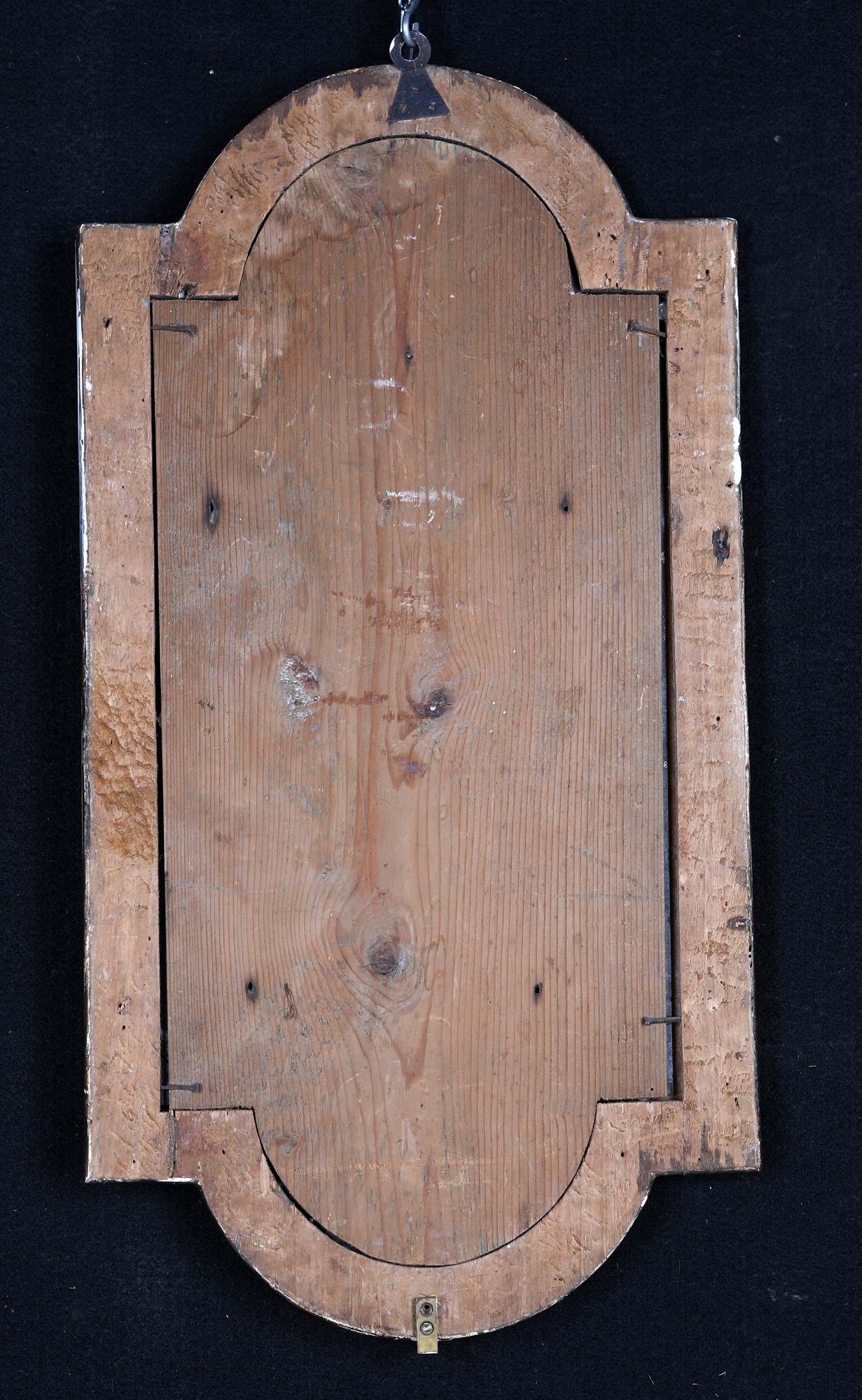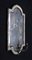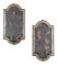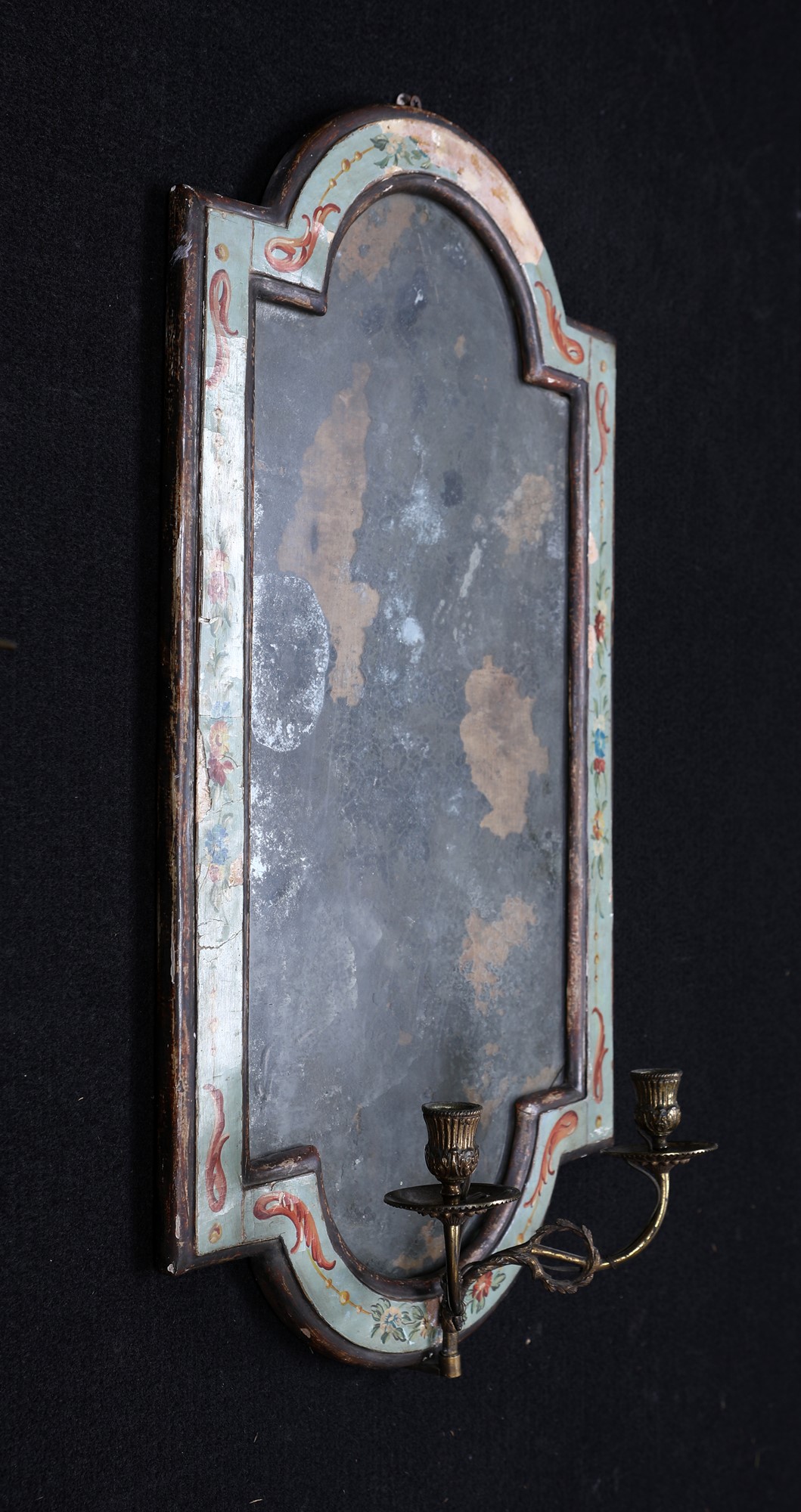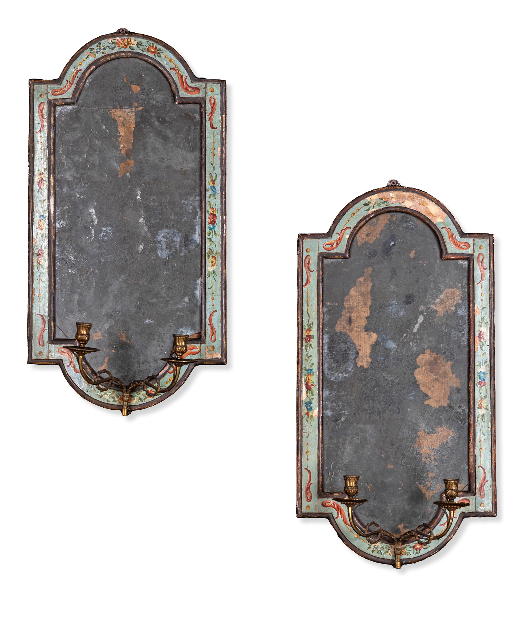 Coppia di specchierine in legno laccato azzurro, Marche, inizi del XIX secolo con vertici centinati e cornici decorate da cascatelle fiorite dipinte nei toni del rosso, dell'azzurro e del verde; dal centro del lato inferiore si dipartono due braccetti reggicandela. Difetti e mancanze