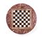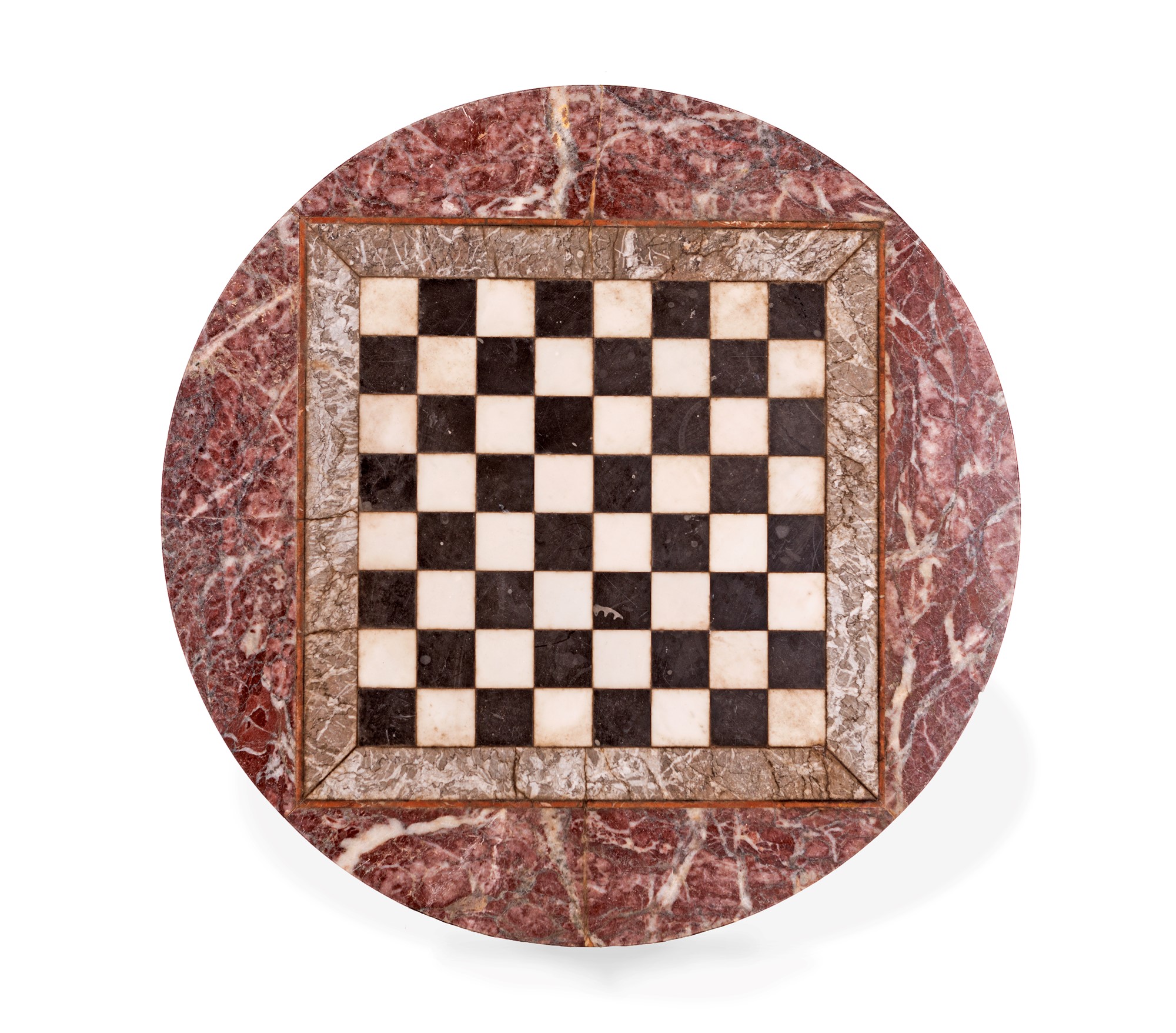 Piano circolare in marmo rosso centrato da scacchiera in commesso di marmi bianco e nero; completo di figure in celluloide per il gioco degli scacchi