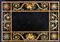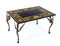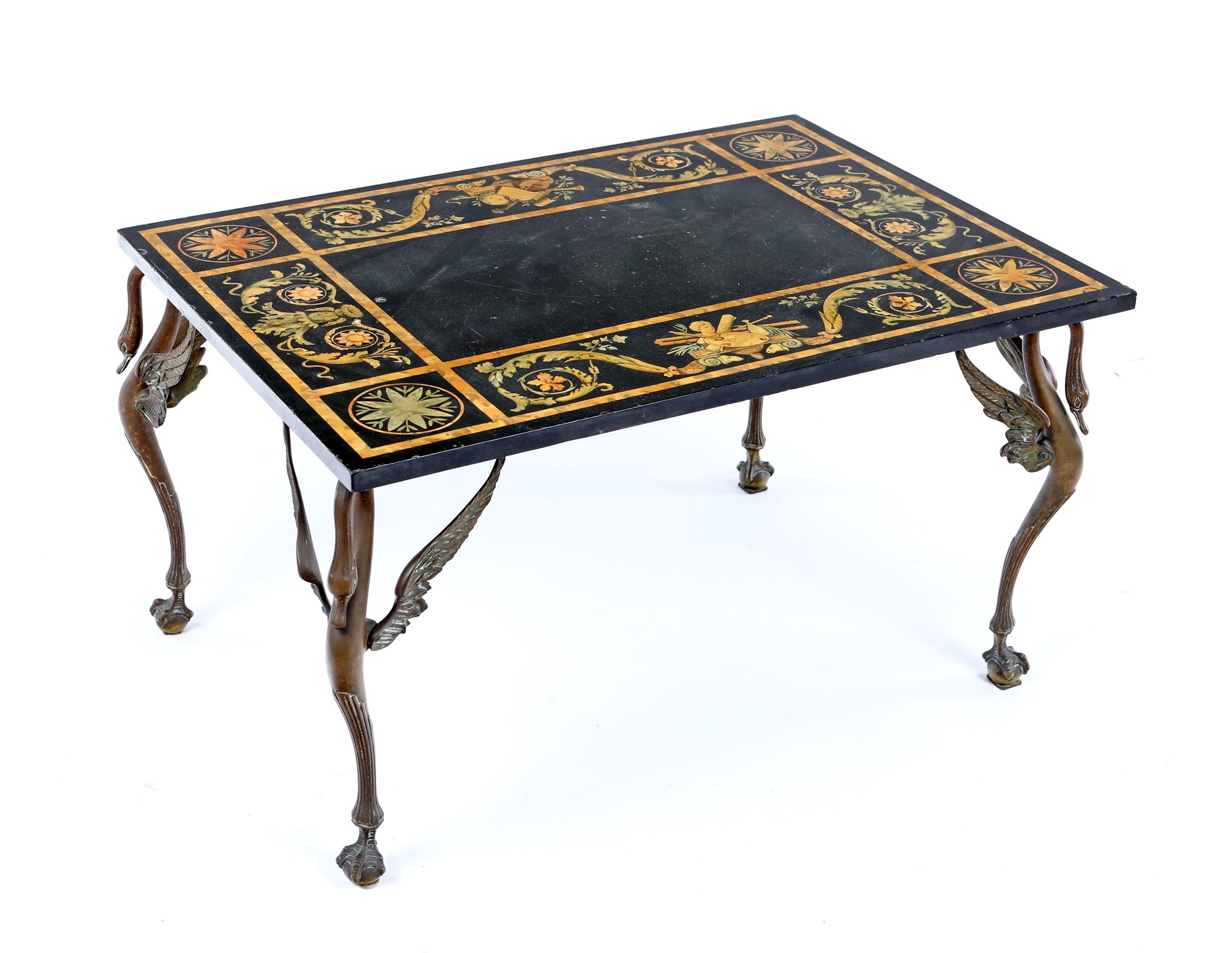 Tavolino basso con piano in scagliola, XIX secolo piano rettangolare nero decorato da una grande fascia perimetrale con volute vegetali che si dipartono da rhyton contrapposti; corolle angolari completano la decorazione. Base in metallo con gambe a forma di cigno, cm 47x83x58