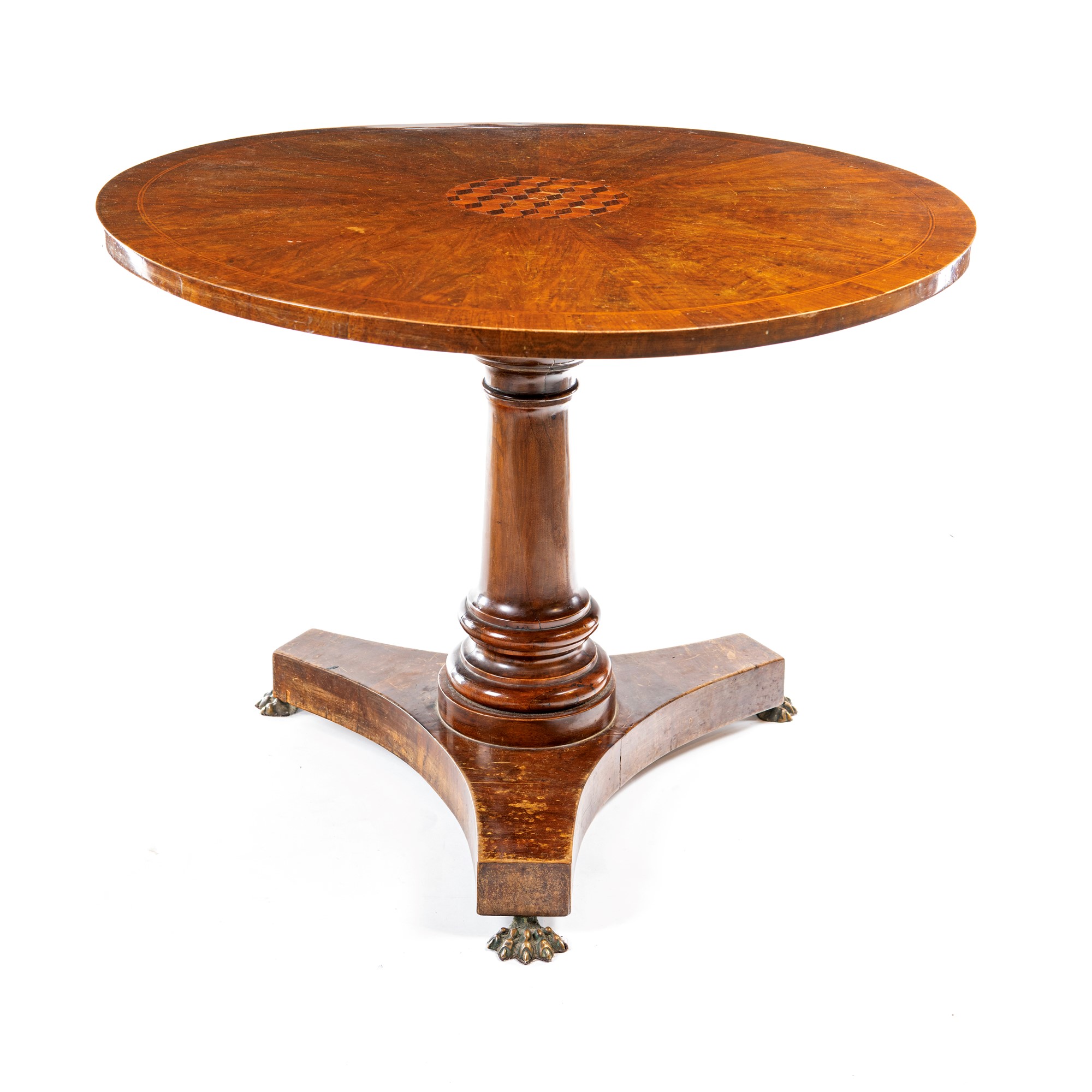Tavolo da centro in mogano, XIX secolo con piano circolare centrato da riserva intarsiata a marqueterie geometrica; sostegno a colonna poggiante su base trilobata; piedi ferini in bronzo, cm 77x101