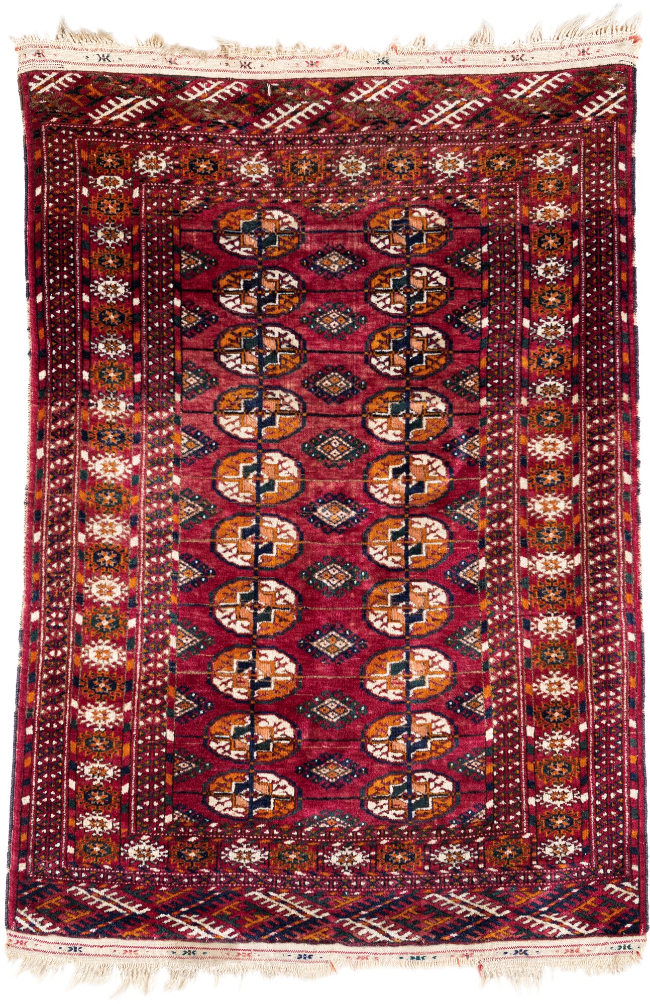 Tappeto Turkmenistan Bukhara di vecchia fattura annodato a mano fondo rosso a due file parallele con dieci medaglioni ognuna nei toni del bianco e dell'ocra, alternate a losanghe in sequenza nei medesimi toni cromatici, entro molteplici bordure , cm 117x83