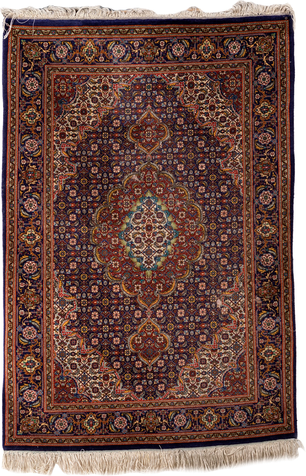Tappeto persiano Tabriz annodato a mano con medaglione centrale bianco e rosso su fondo blu e fitta decorazione floreale a tutto campo entro molteplici bordure, cm 138x95