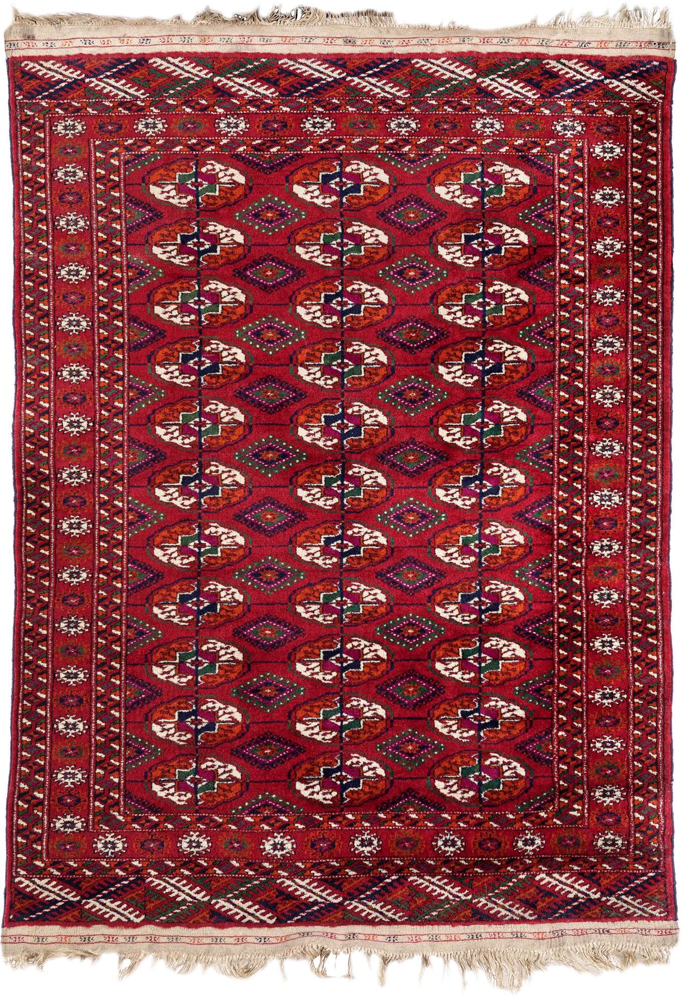 Lotto 119 | Tappeto Turkmenistan annodato a mano, disegno Bukhara fondo rosso con tre...