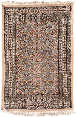 Piccolo tappeto Pakistan a disegno Bukara a disegno geometrico celeste, beige e avorio entro molteplici piccole bordure, cm 95x64