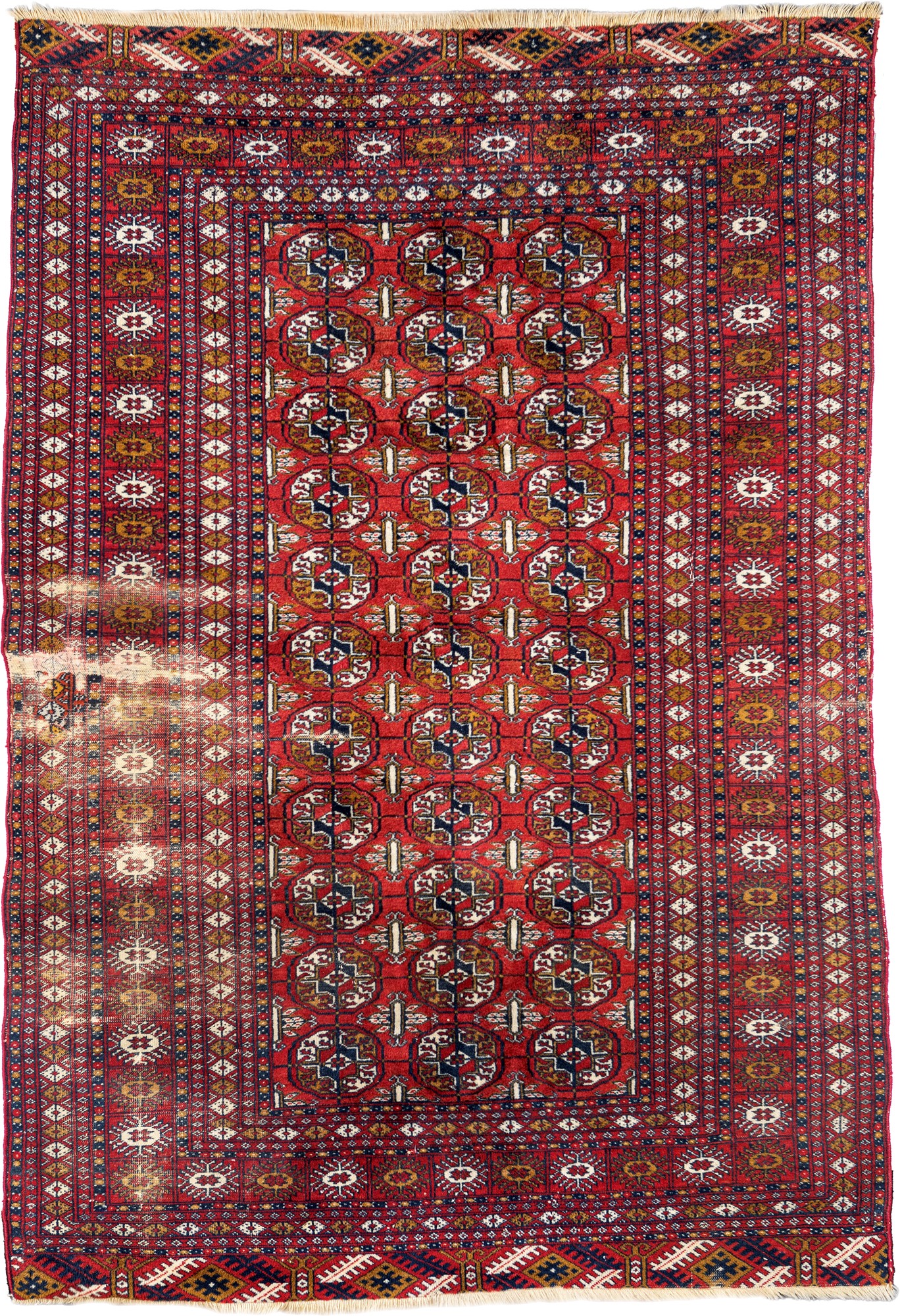 Tappeto Pakistan disegno Bukhara annodato a mano fondo rosso a tre file con undici medaglioni ognuna, entro molteplici bordure. Difetti , cm 180x122