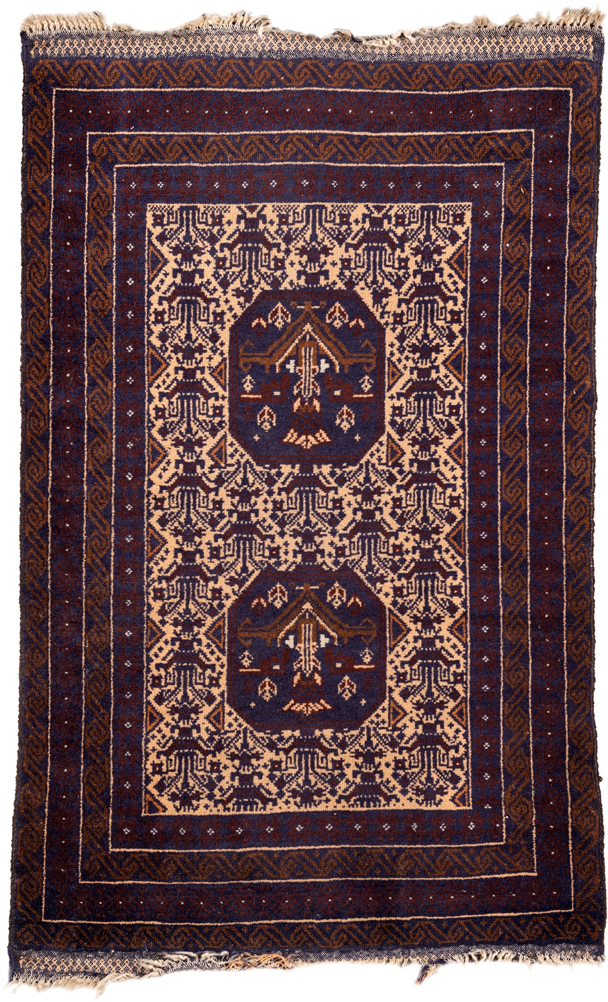 Tappeto Baluchistan fondo chiaro annodato a mano con due medaglioni e fitta decorazione in blu e bordeau entro molteplici piccole bordure, cm 131x85
