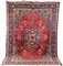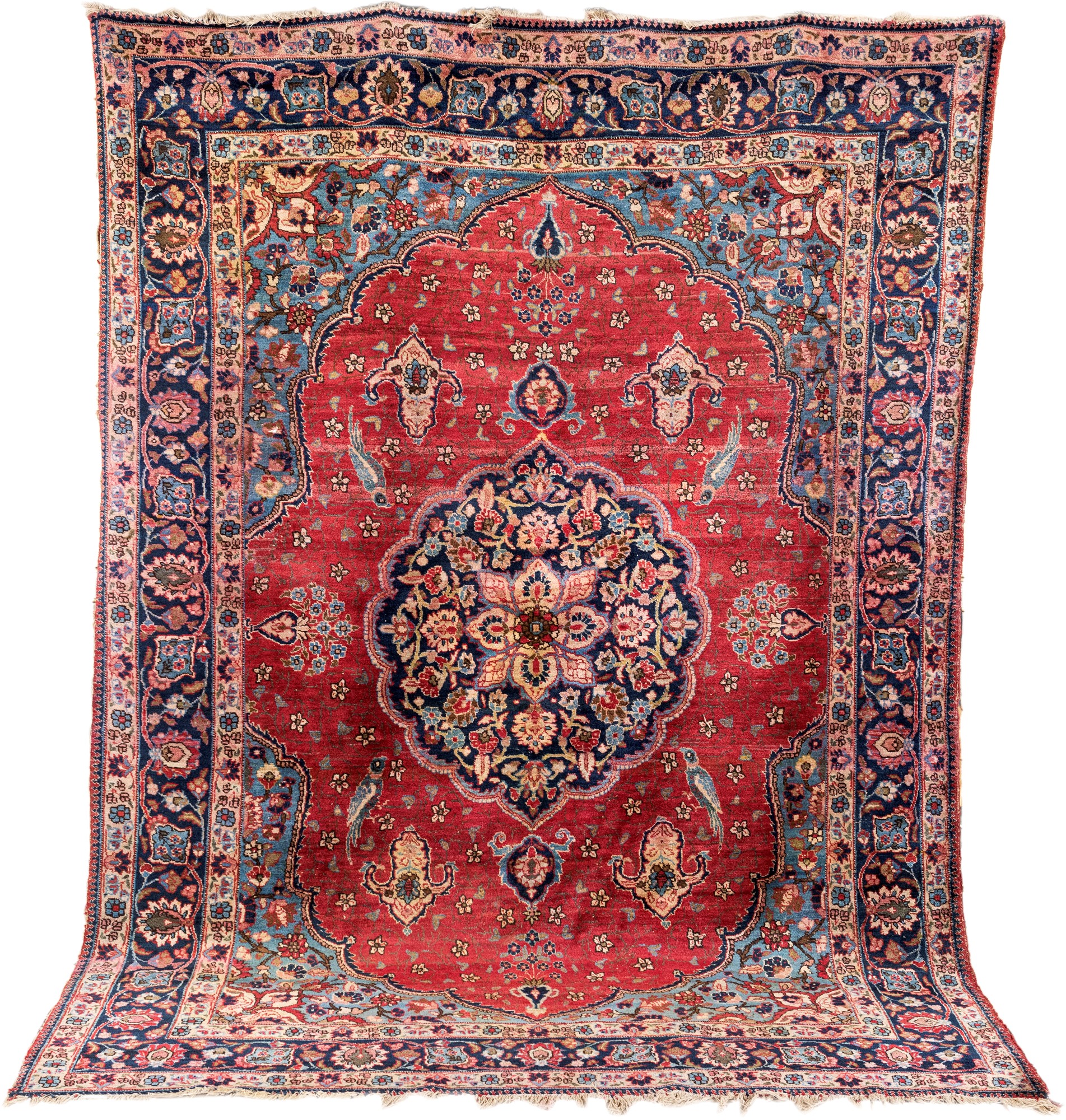 Grande tappeto persiano Tabriz fondo rosso con medaglione blu e motivi sparsi fra cui uccelli. Difetti, cm 230x315