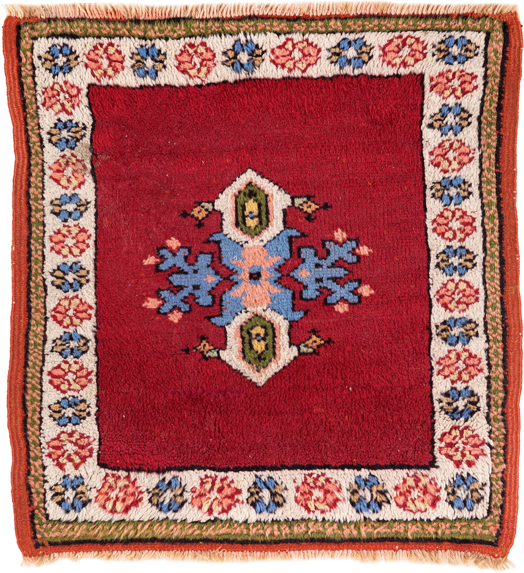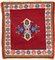 Piccolo tappeto quadrangolare, Anatolia fondo rosso con medaglione centrale; cornice bianca a corolle alternate rosse e azzurre, cm 53x56