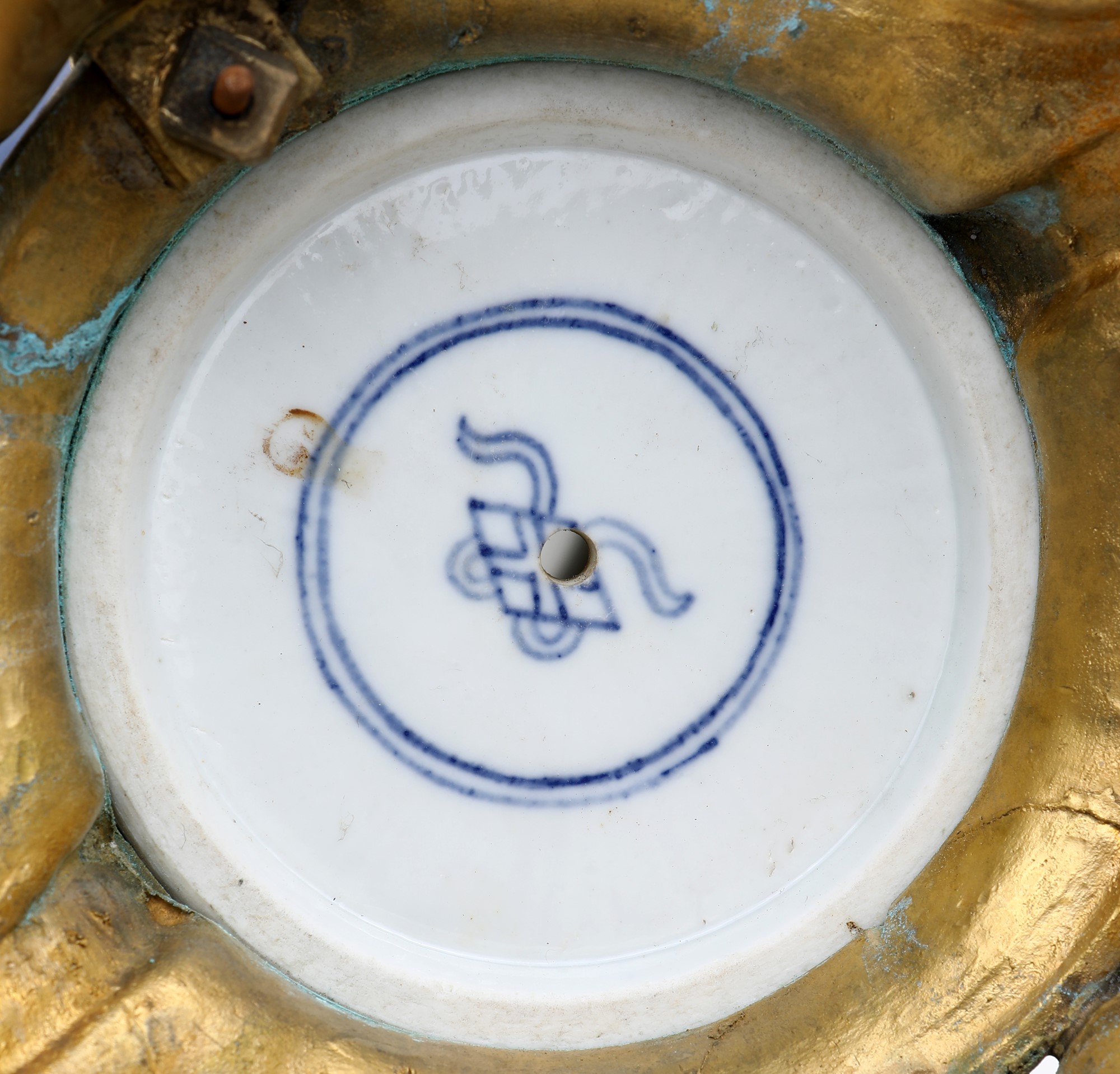 Vaso in porcellana blu e bronzo dorato, Francia, XIX secolo con corpo ad anfora arricchito da finiture ornamentali in forma di cascatelle e rilievi vegetali, altezza cm 56