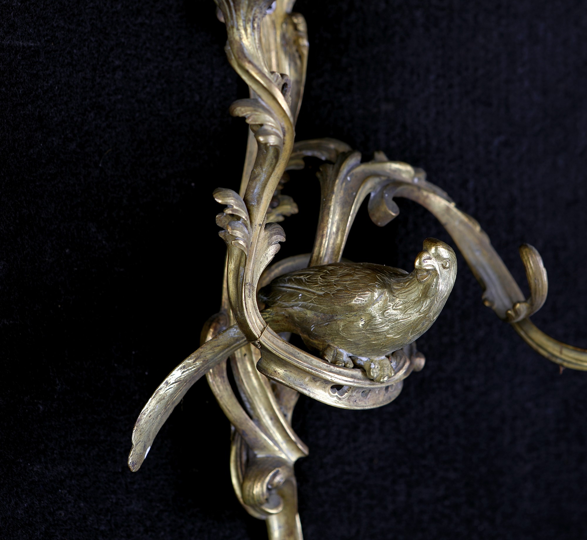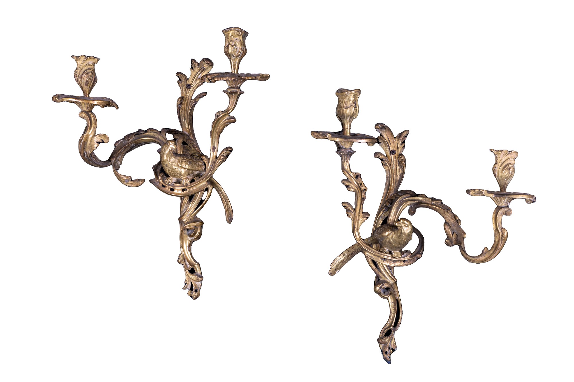Coppia di appliques a due luci in bronzo dorato, XIX secolo caratterizzate da figure di volatile concepite per essere disposte vis à vis e due bracci fitomorfici di altezza asimmetrica arricchiti da elementi vegetali, cm 43x30x18