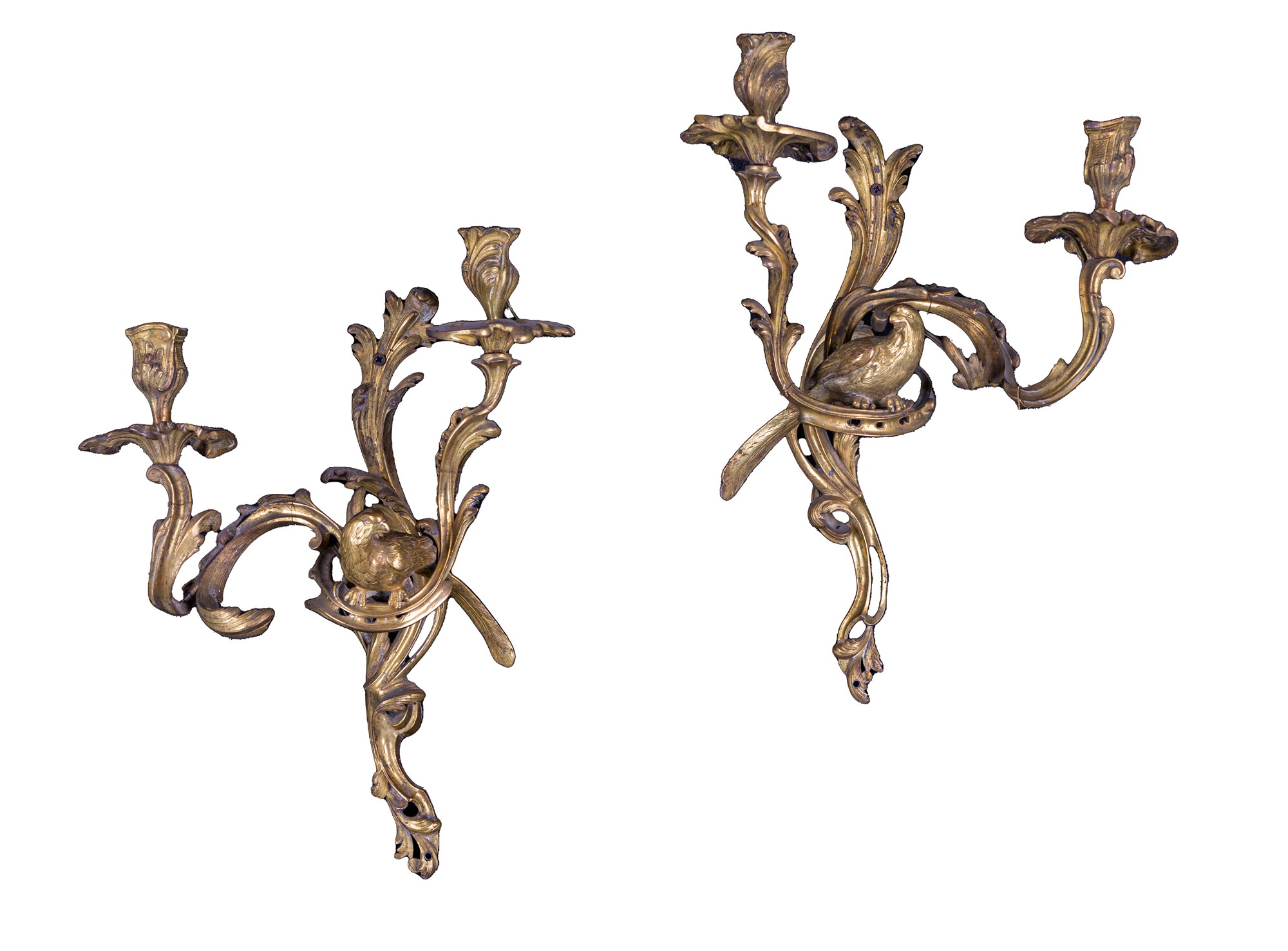 Coppia di appliques a due luci in bronzo dorato, XIX secolo caratterizzate da figure di volatile concepite per essere disposte vis à vis e due bracci fitomorfici di altezza asimmetrica arricchiti da elementi vegetali, cm 43x30x18