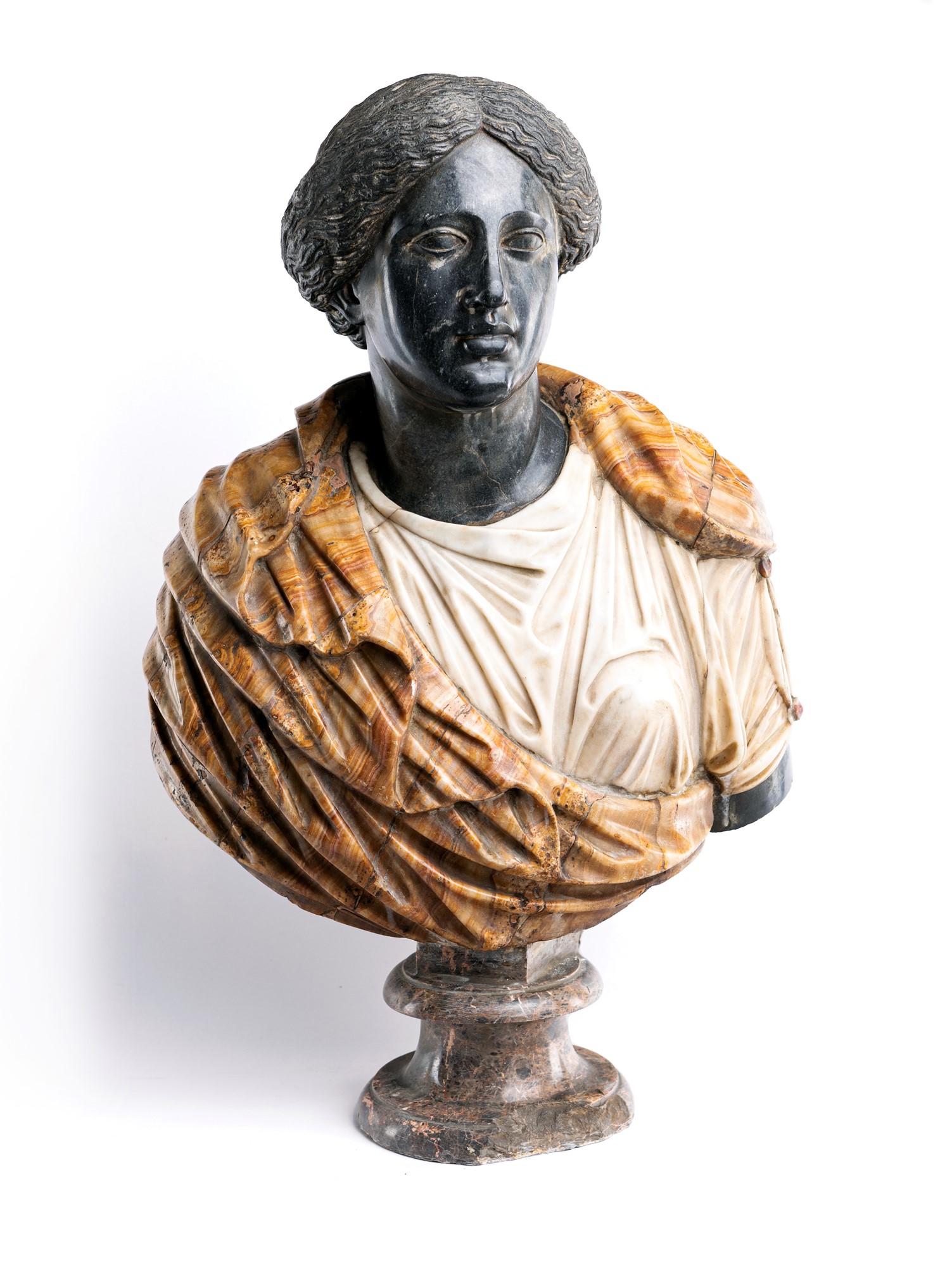 Busto femminile in marmi policromi, inizi del XVII secolo con testa in basaltina lievemente rivolta verso la spalla sinistra, peplo bianco e toga in alabastro del Circeo; piedistallo a rocchetto, altezza cm 74x44x24 ca.