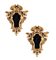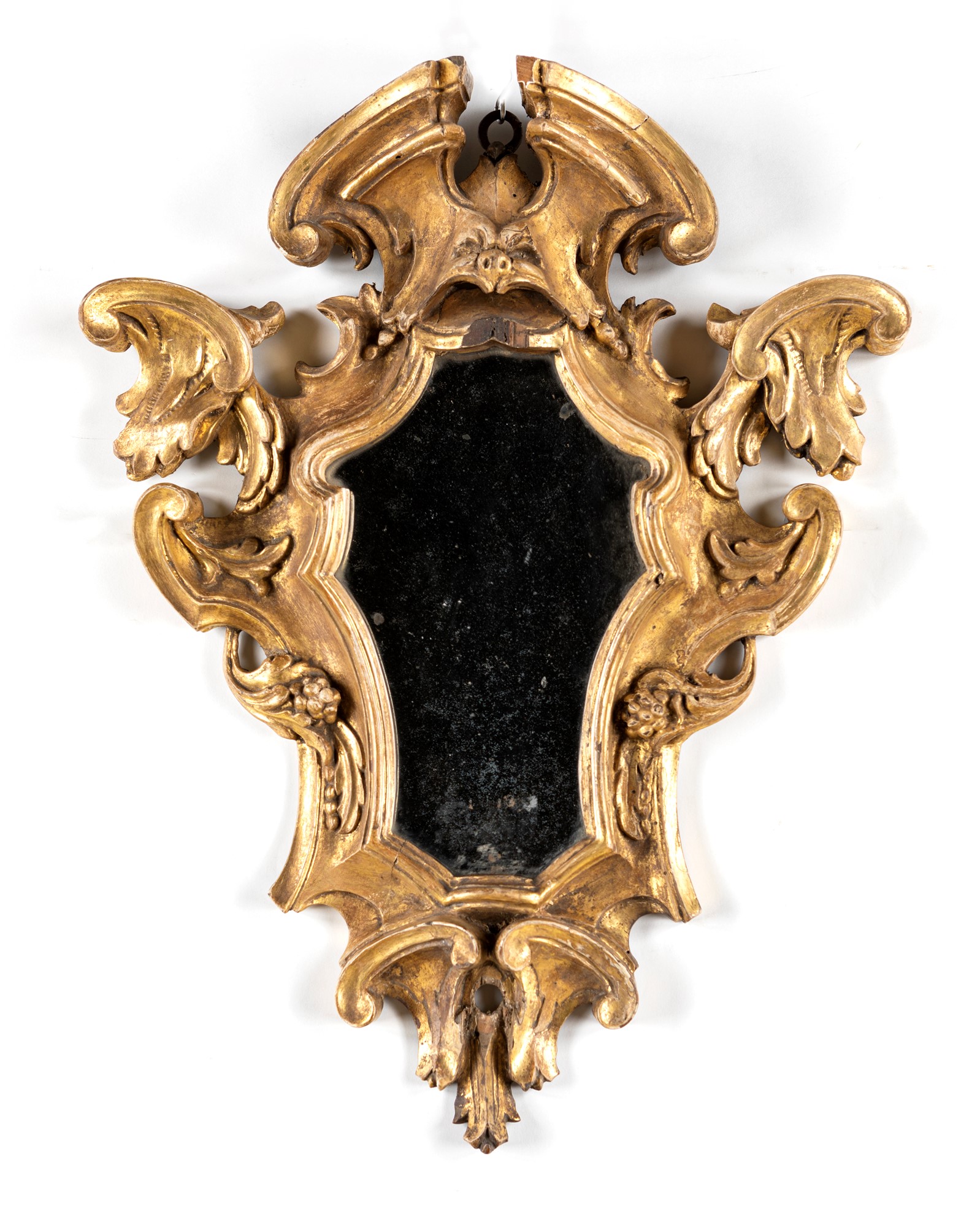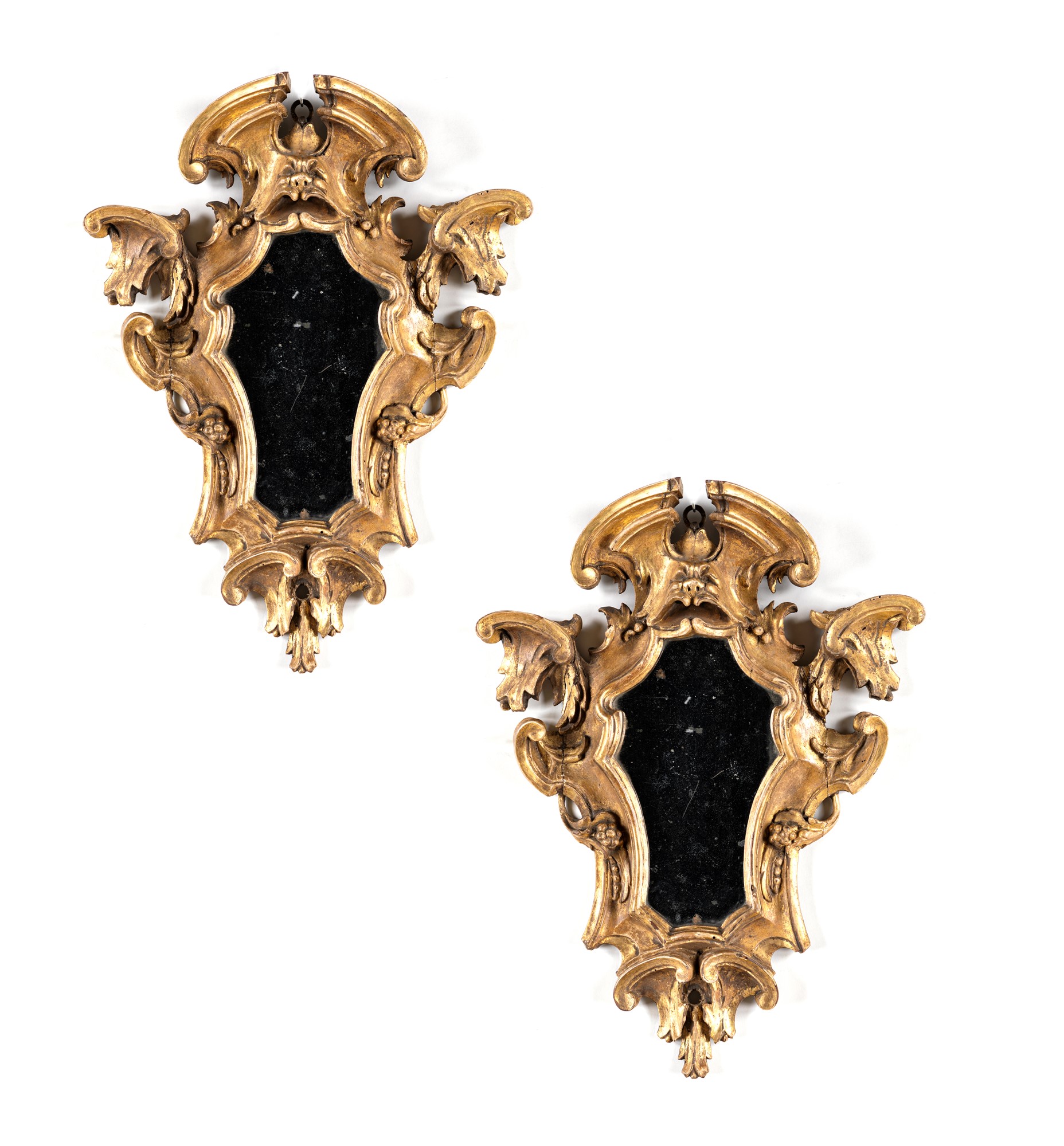 Coppia di piccole specchiere in legno dorato, Roma, XVIII secolo di forma sagomata con cornici modanate spezzate e mascheroni grotteschi, cm 60x45