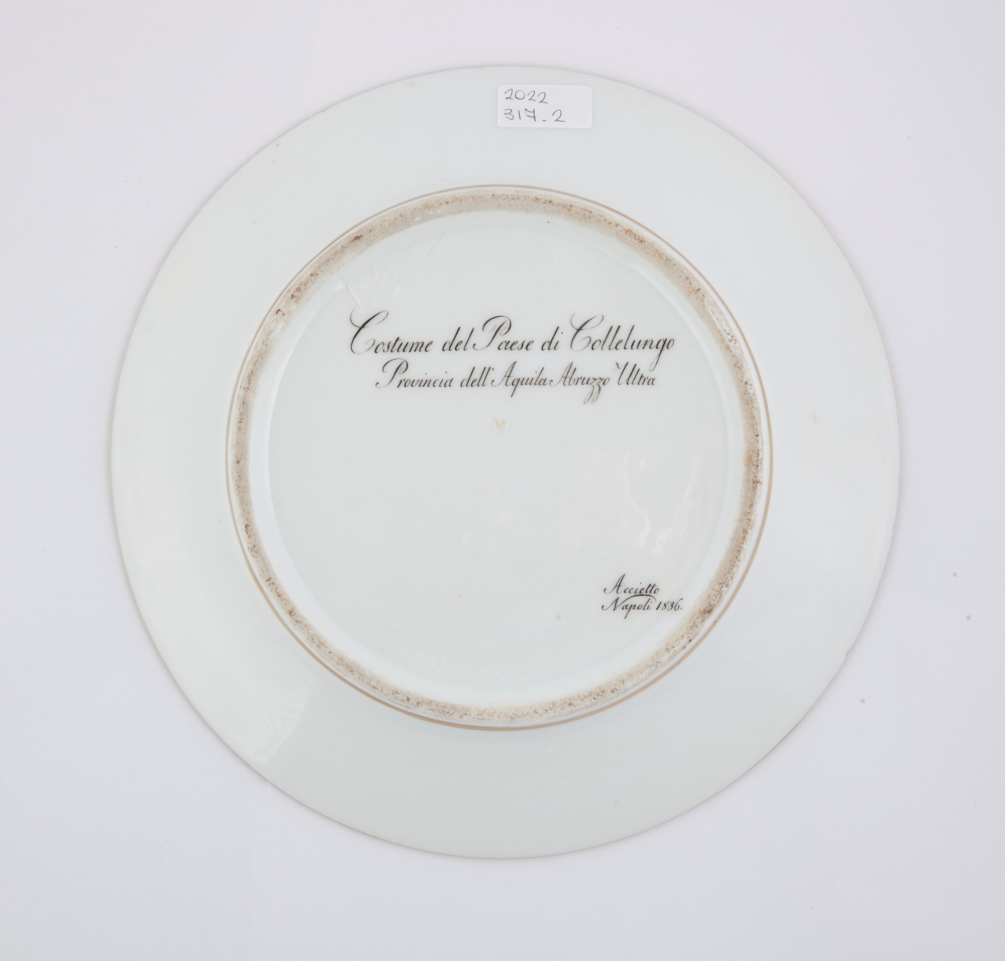 decorato al centro in vivace policromia con figure in costumi popolari tradizionali affiancati da una pecora e ambientati in un paesaggio; tesa decorata in oro a motivi naturalistici ripetuti. Iscritto al verso, in corsivo a pennello: Costume del Paese di Collelungo Provincia dell'Aquila Abruzzo Ultra, firmato e datato: Accietto, Napoli 1836