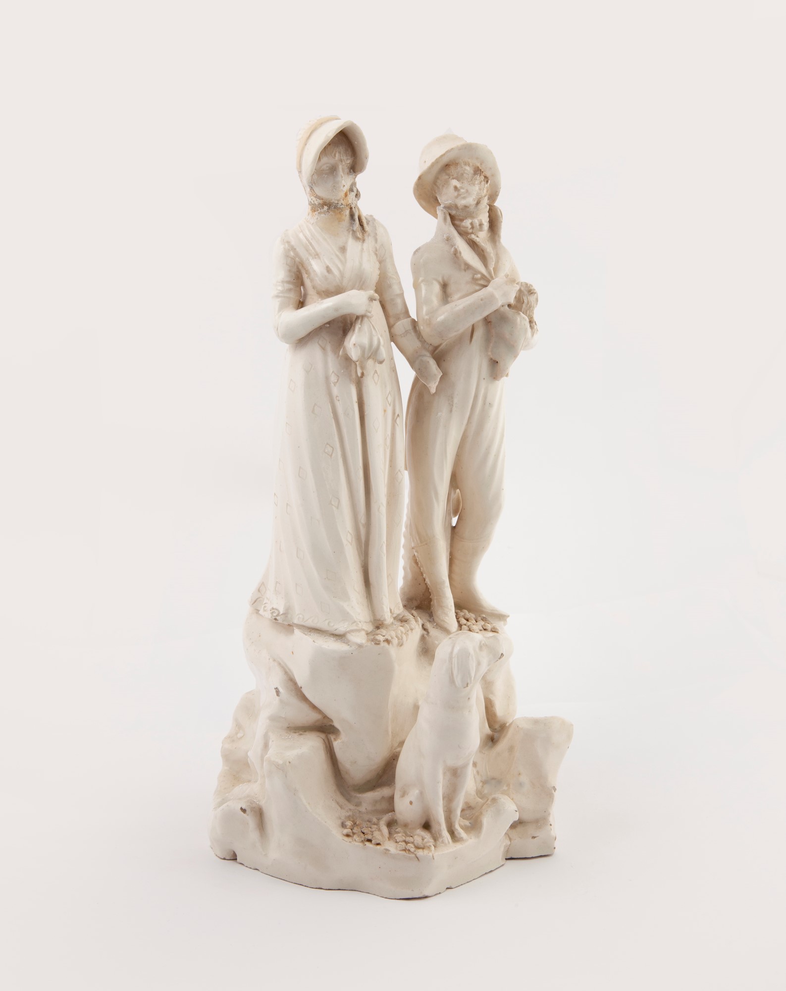 Gruppo in terraglia, Napoli, manifattura Giustiniani, inizi del XIX secolo raffigurante una coppia a passeggio con cani. Restauri, rotture e piccole mancanze, altezza cm 24