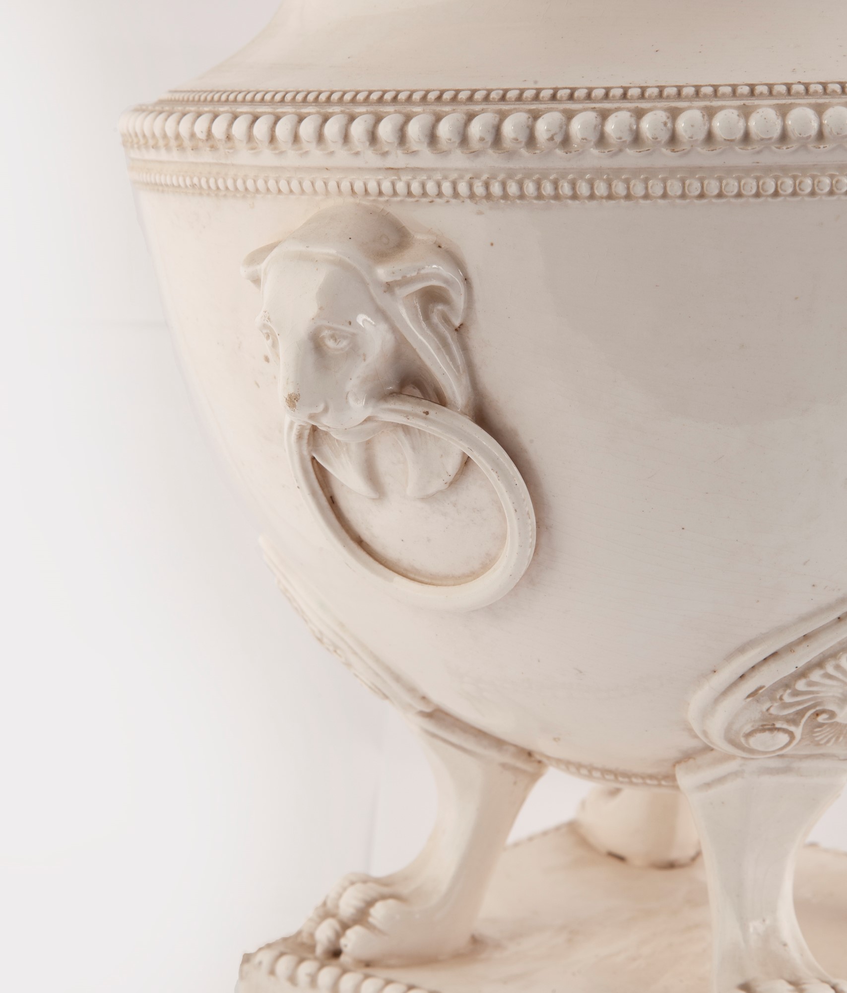 Zuppiera in terraglia, Napoli, prima metà del XIX secolo decorata in gusto neoclassico a rilievo con quattro zampe ferine con attacchi a palmetta e mascheroni; base squadrata sottolineata da perline. Coperchio mancante. L'attribuzione ad una fornace napoletana si basa, oltre che su evidenze di stile, sulla somiglianza con forme caratteristiche della produzione ceramica neoclassica partenopea prodotte nelle fornaci Giustiniani e Del Vecchio, cm 35x29