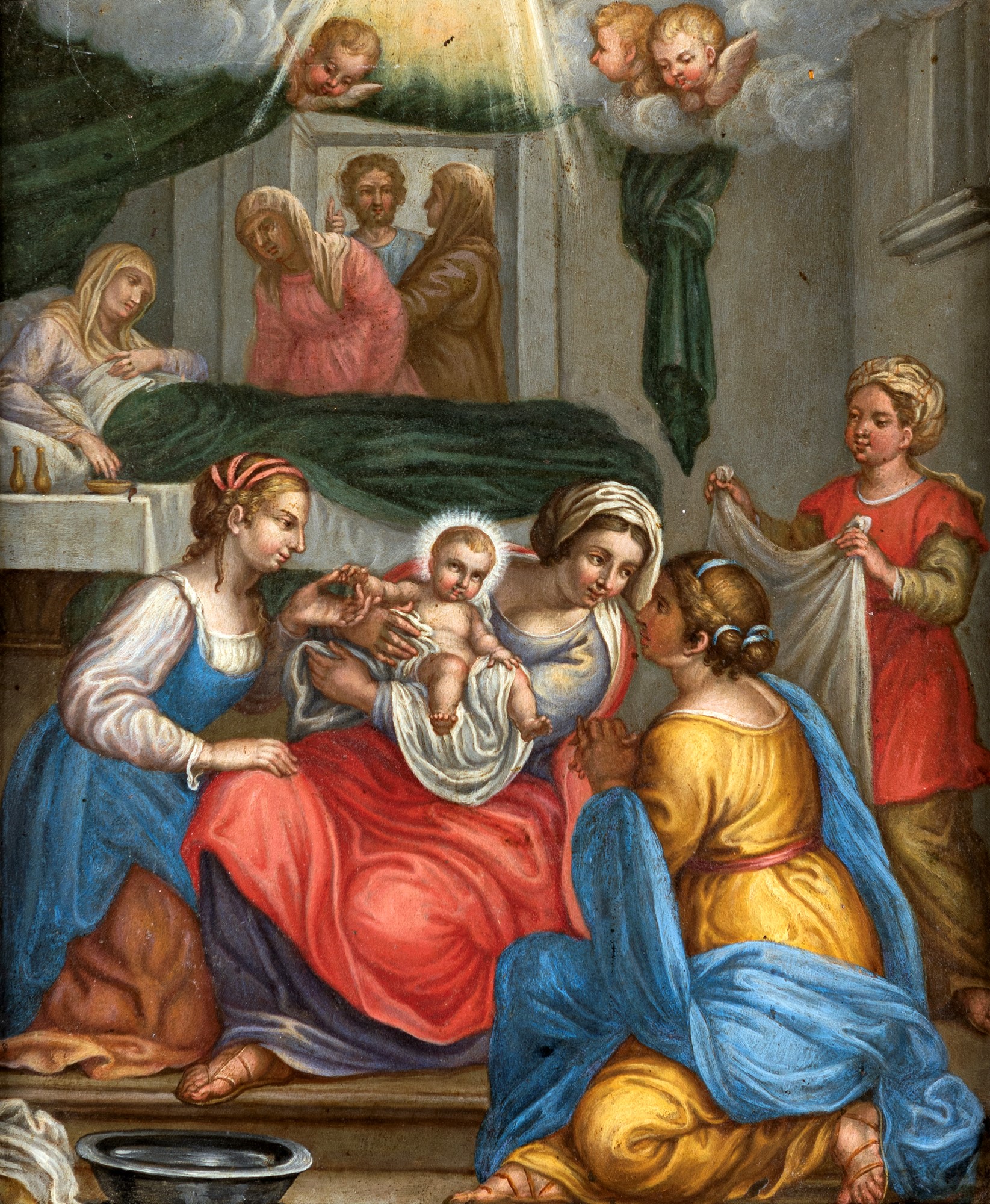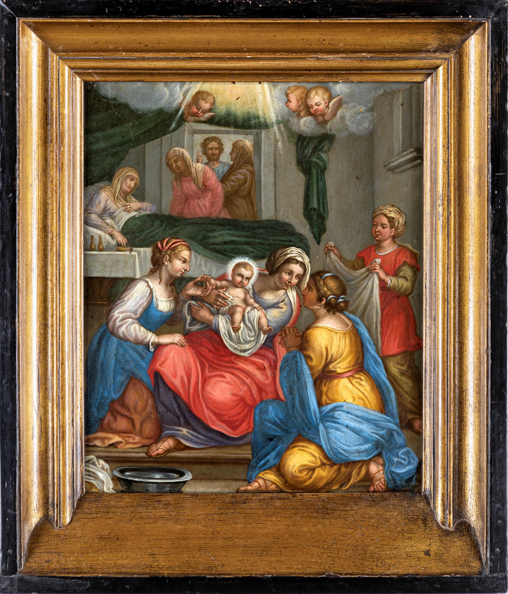 Pittore romano del XVII secolo Nascita del Battista Olio su rame, cm 32x27 -...