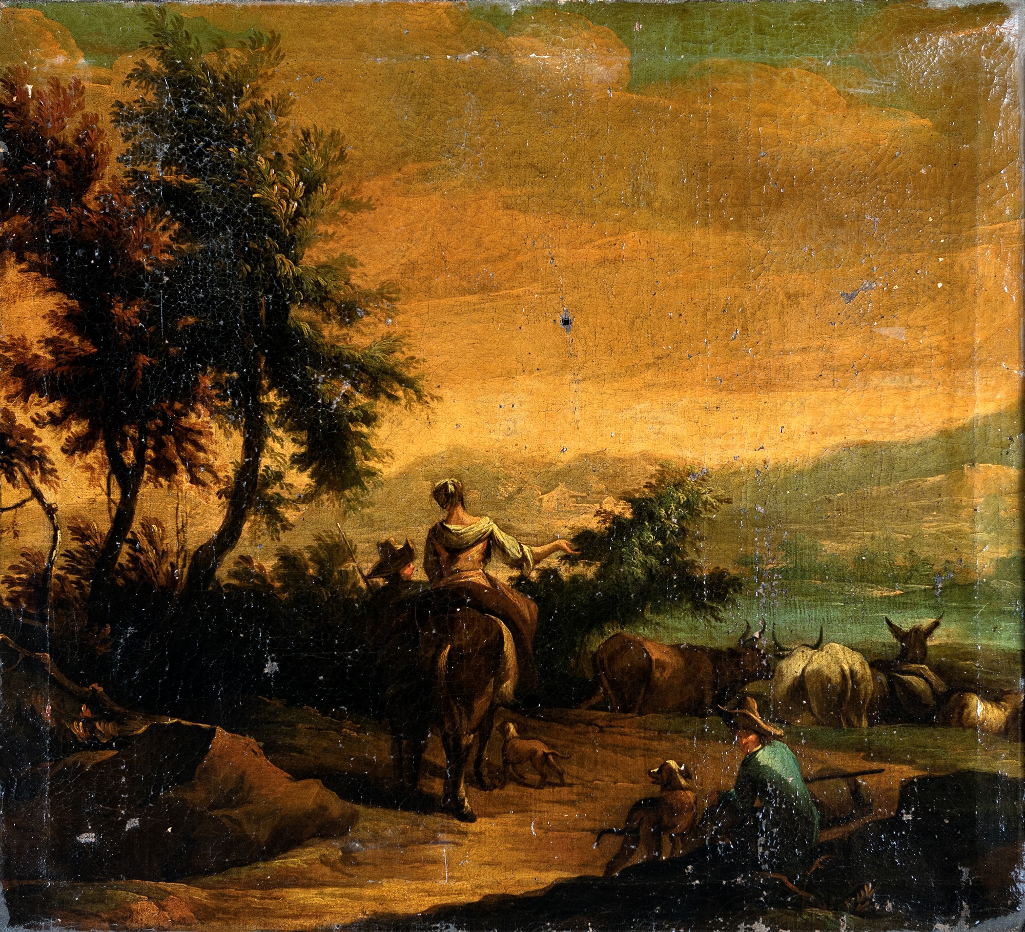 Lotto 273 | Scuola Romana del XVII secolo Paesaggio con pastori olio su tela, cm 84 x 76...
