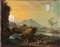 Scuola Romana del XVII secolo Paesaggio fluviale con edifici e montagne in...